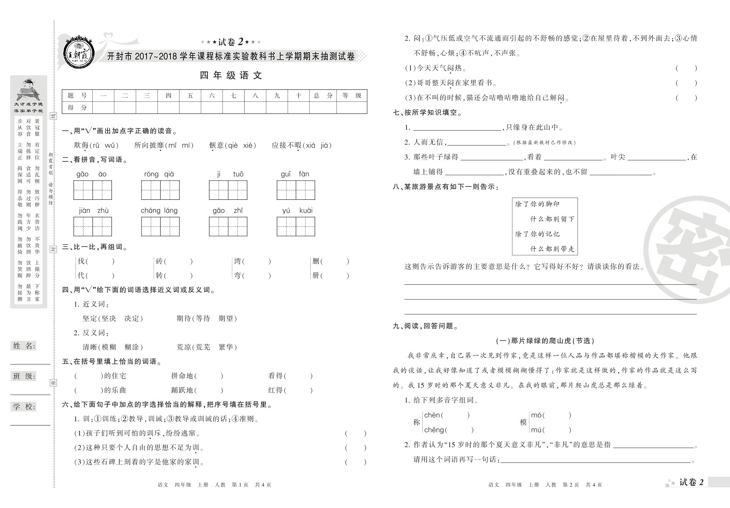 2017-2018学年第一学期开封市四年级语文试卷(人教版)【2】