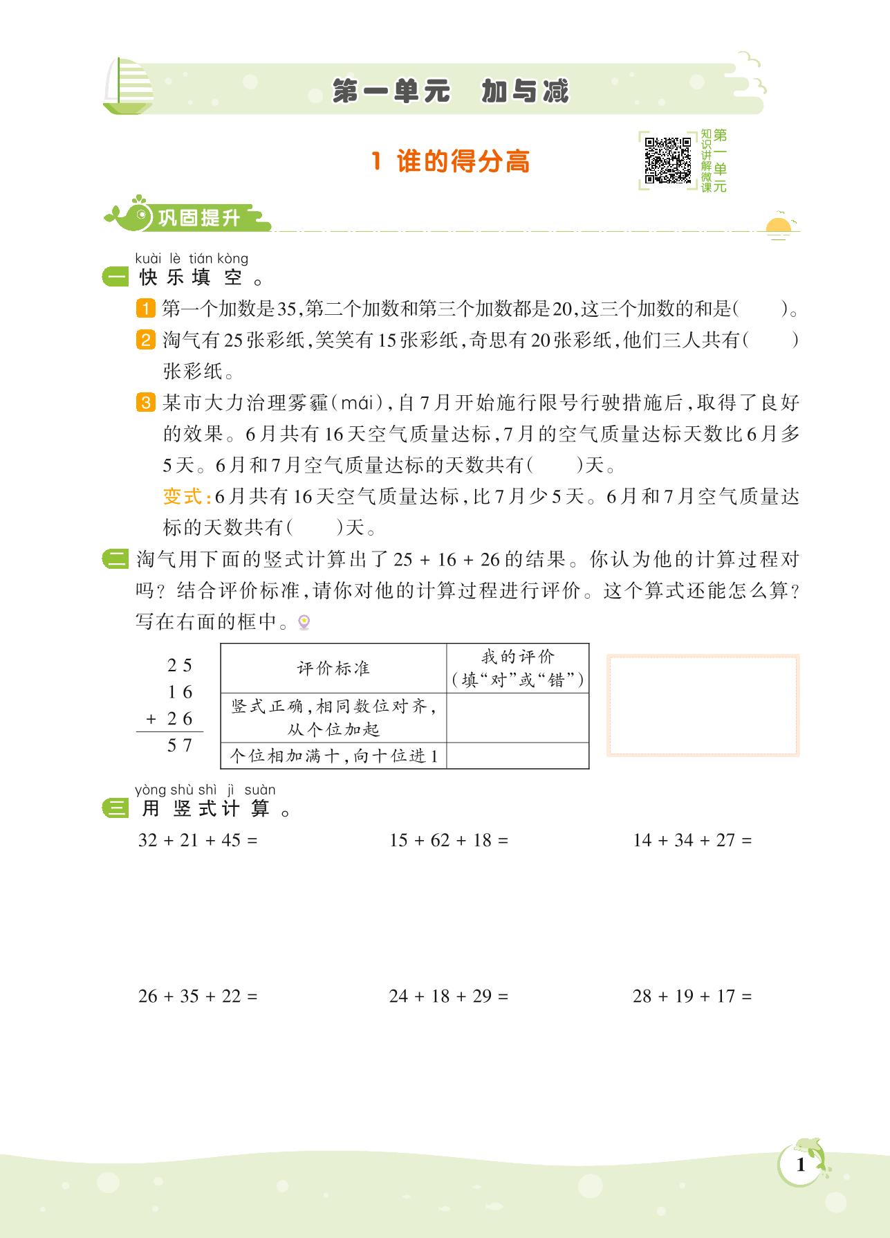 2021上册二年级数学北师版 第一单元 加与减——1 谁的得分高