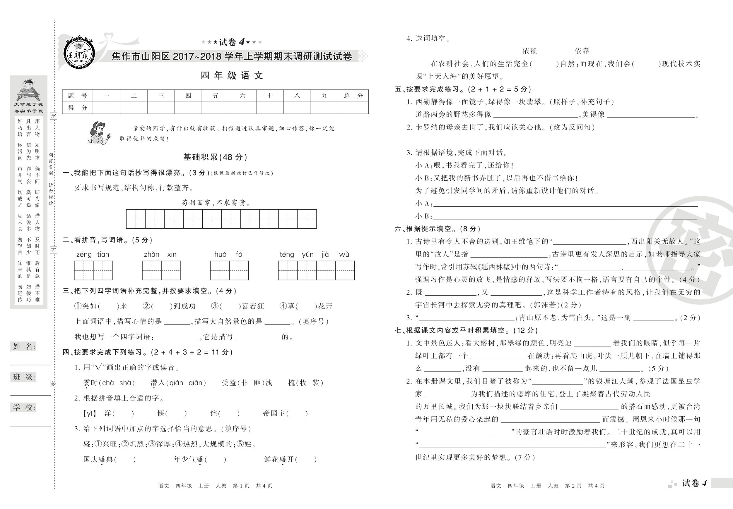 2017-2018学年第一学期焦作市山阳区四年级语文试卷(人教版)【4】