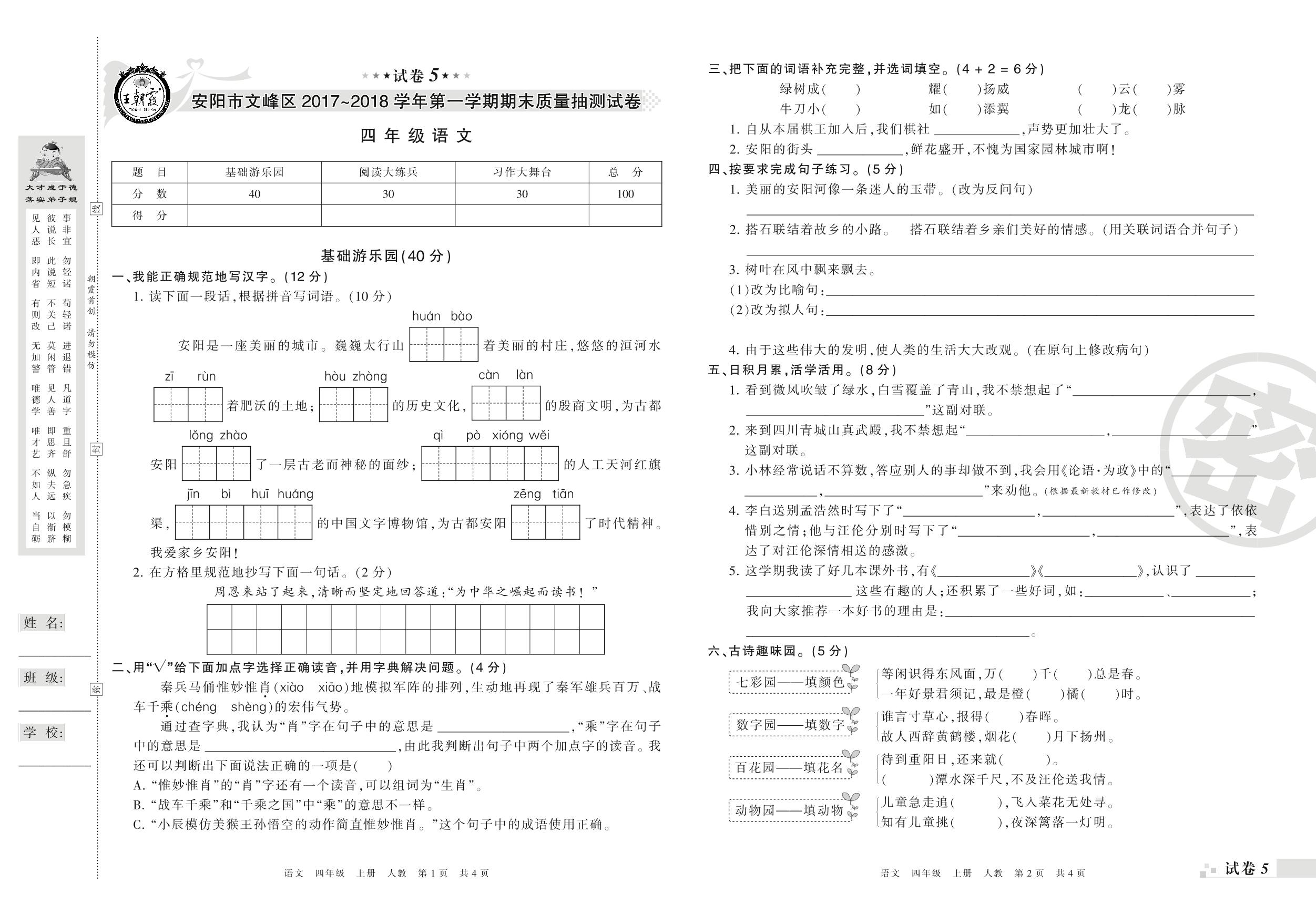 2017-2018学年第一学期安阳市文峰区四年级语文试卷(人教版)【5】