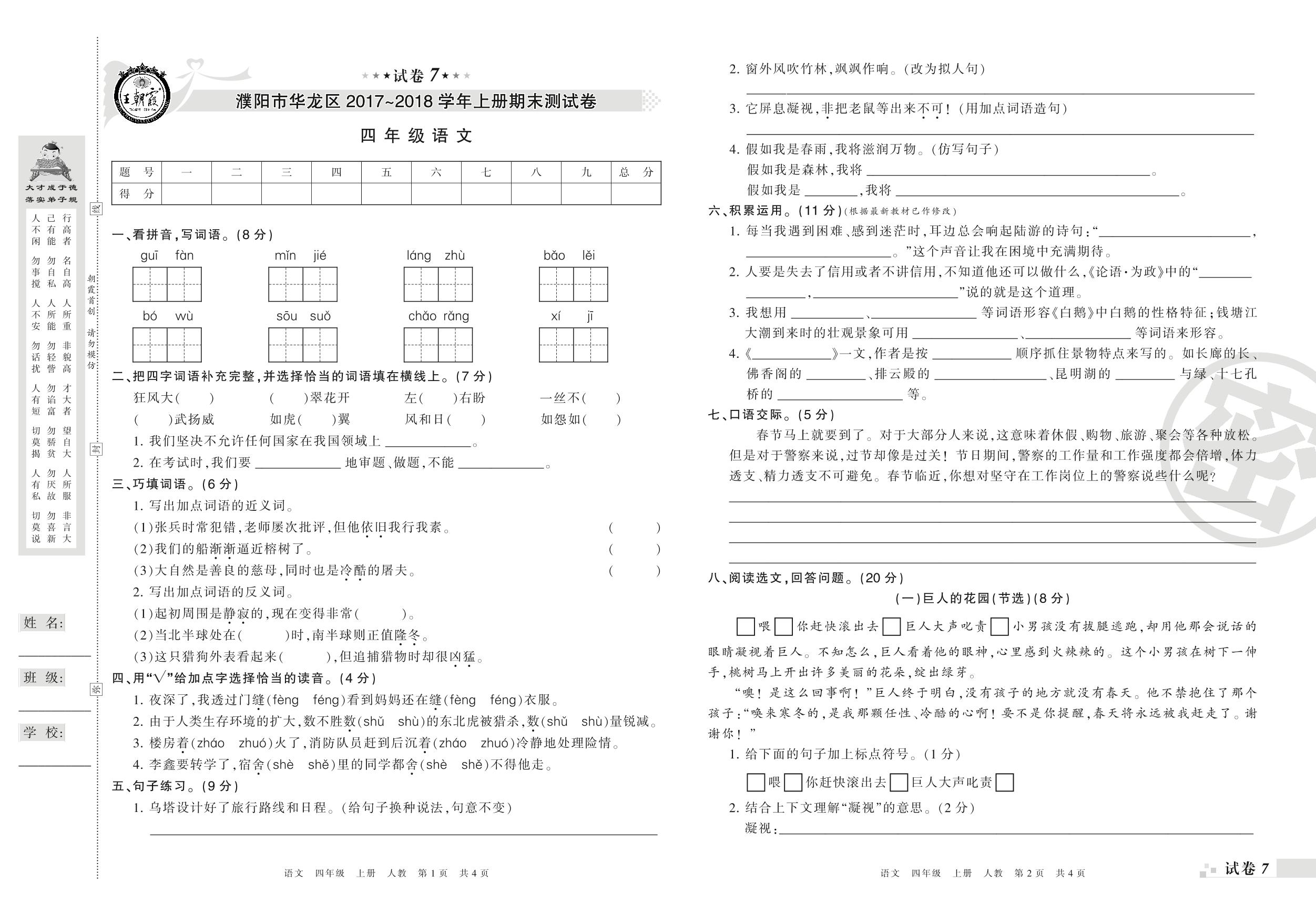 2017-2018学年第一学期濮阳市华龙区四年级语文试卷(人教版)【7】