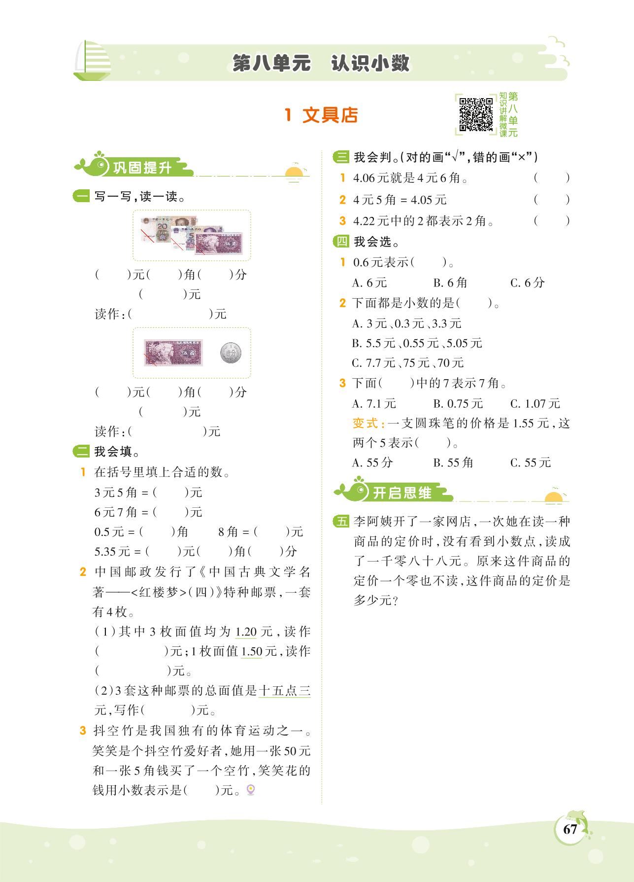 2021上册三年级数学北师版 第八单元 认识小数——1 文具店