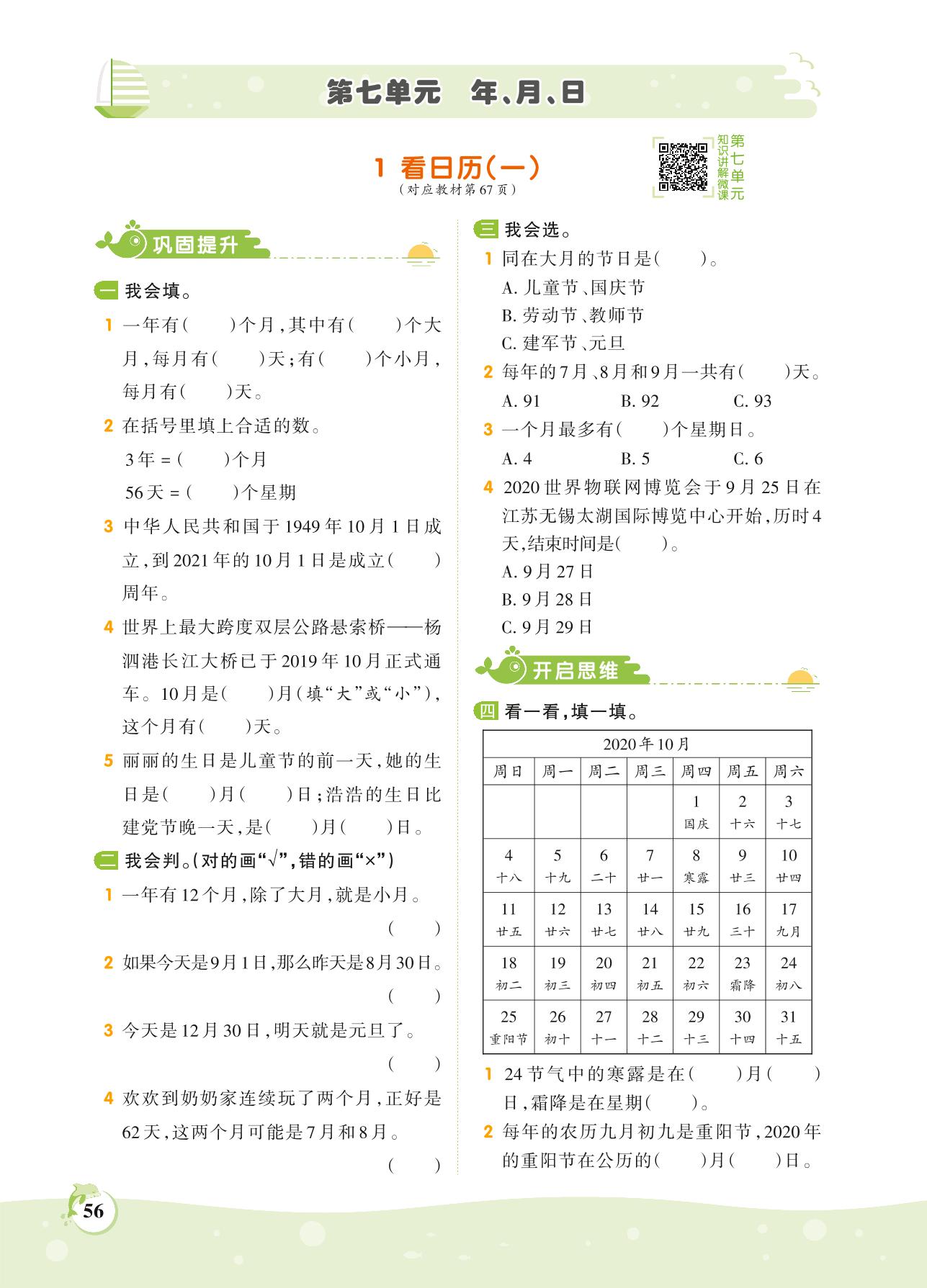 2021上册三年级数学北师版 第七单元 年、月、日——1 看日历(一)