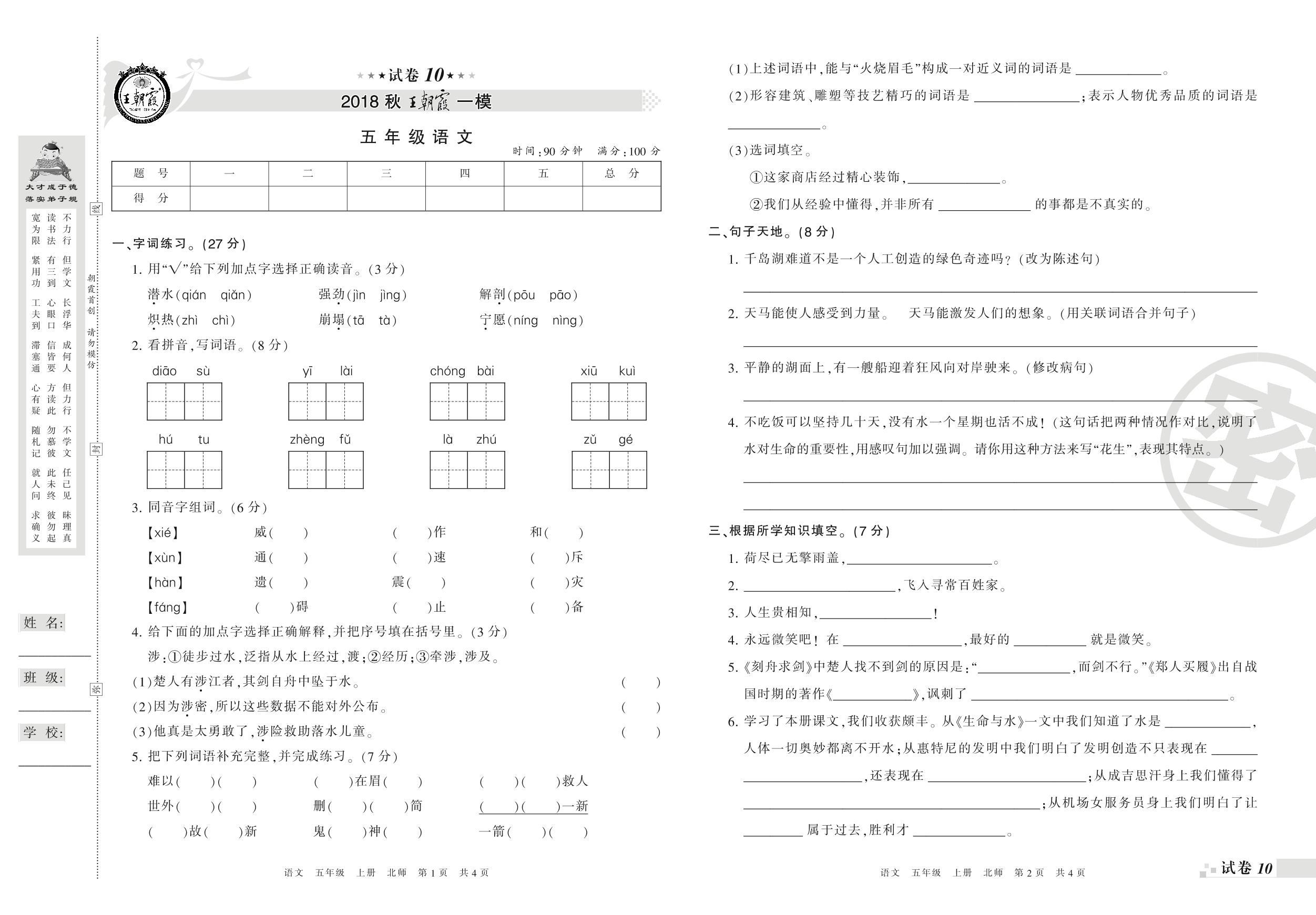 王朝霞期末模拟卷五年级上册语文(北师版)【10】