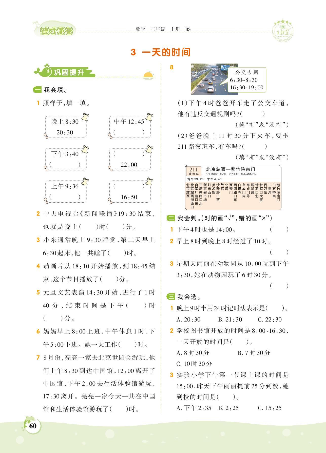 2021上册三年级数学北师版 第七单元 年、月、日——3 一天的时间