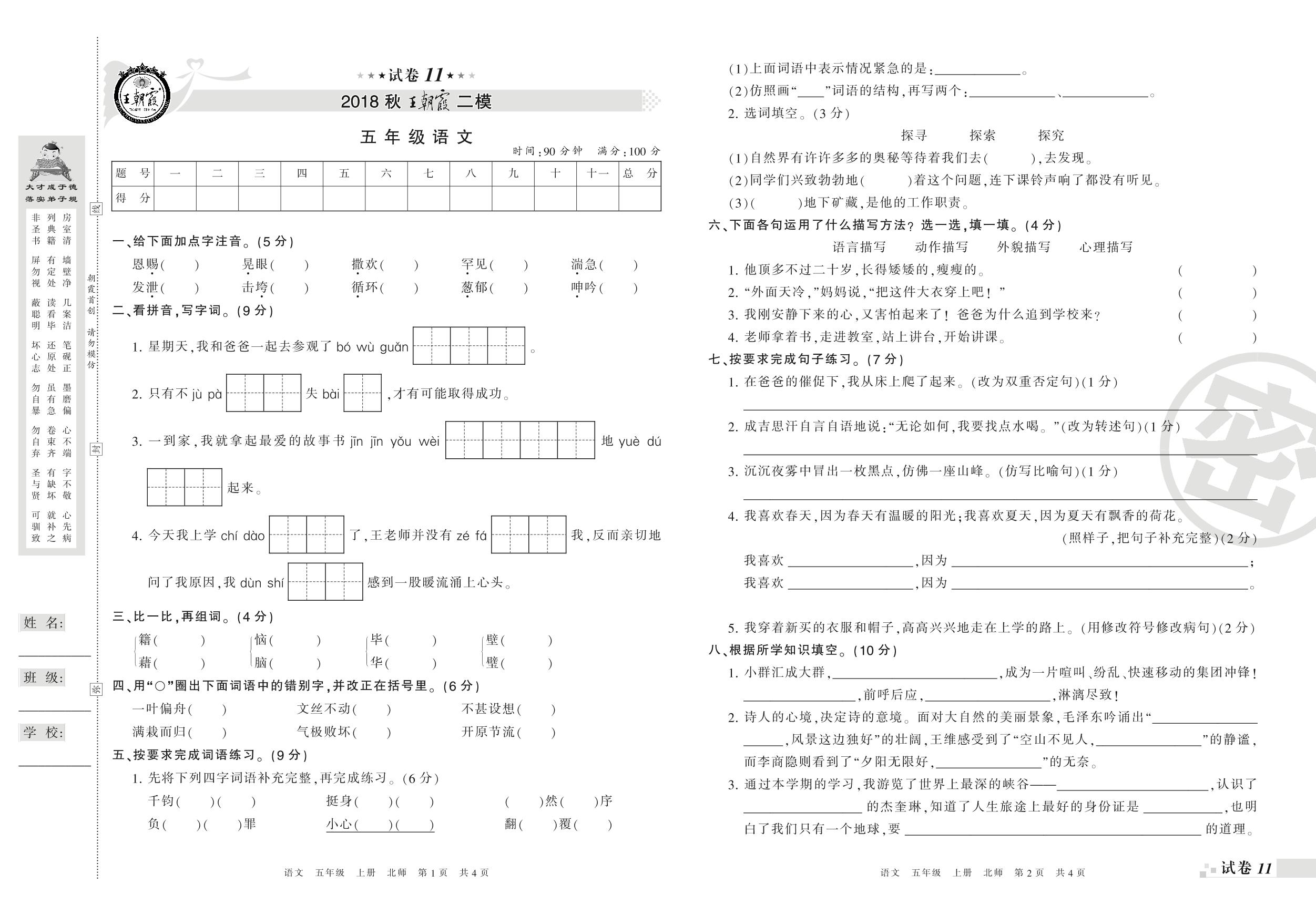 王朝霞期末模拟卷五年级上册语文(北师版)【11】