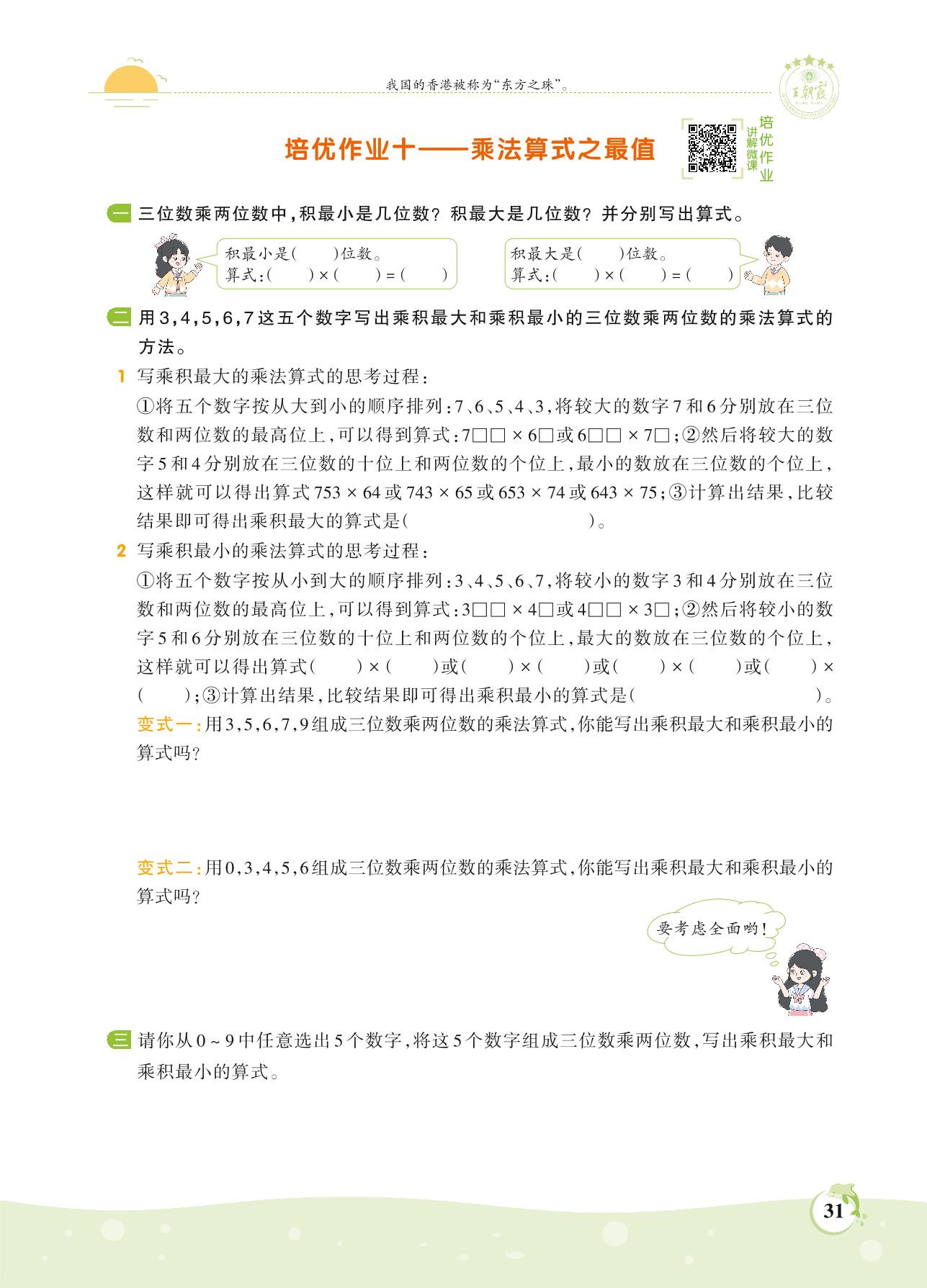 2021上册四年级数学北师版 第三单元 乘法——培优作业十 乘法算式之最值
