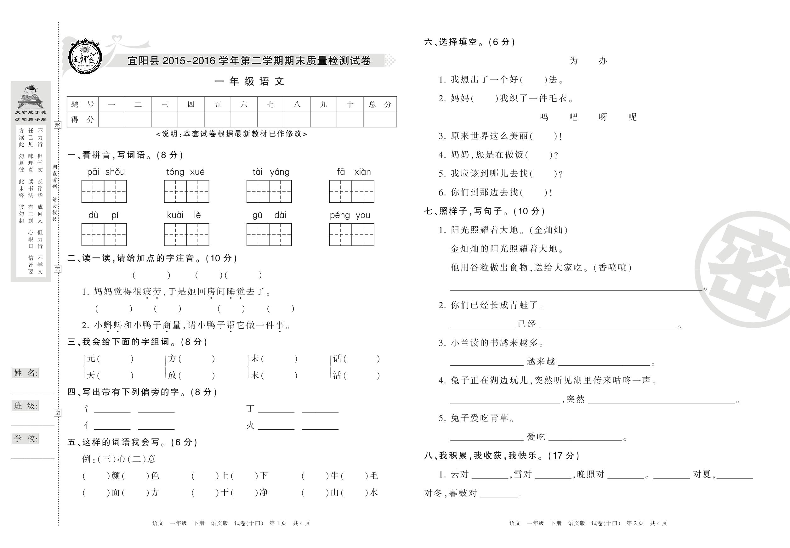 2015-2016学年第二学期洛阳市宜阳县一年级语文试卷(语文版)【14】