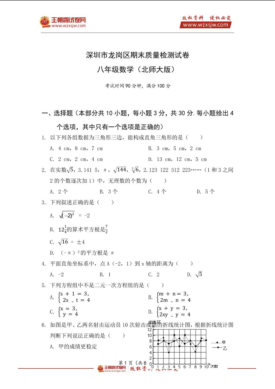 深圳市龙岗区期末质量检测试卷八年级数学(北师大版)