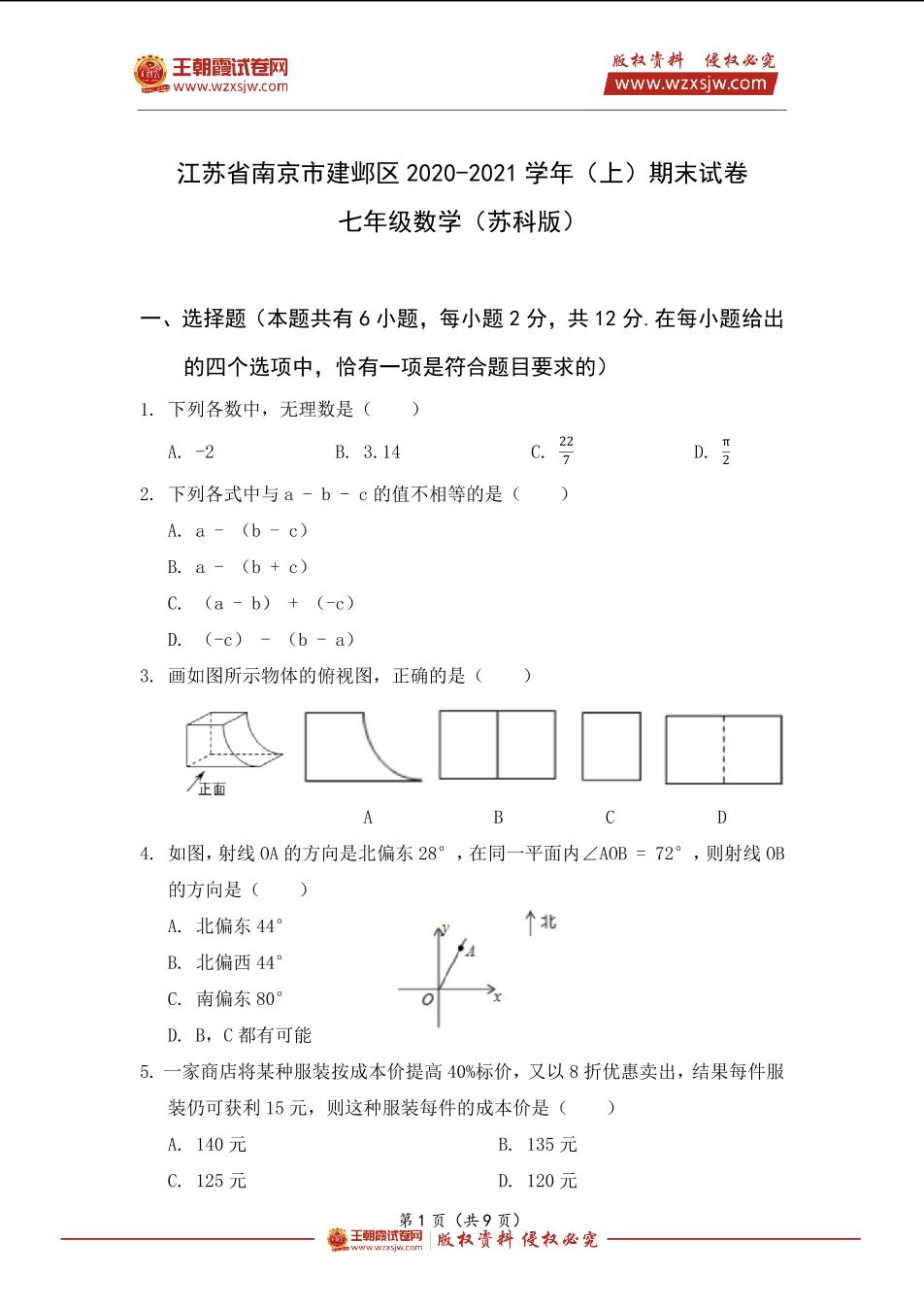 江苏省南京市建邺区2020-2021学年七年级(上)期末数学试卷(苏科版)