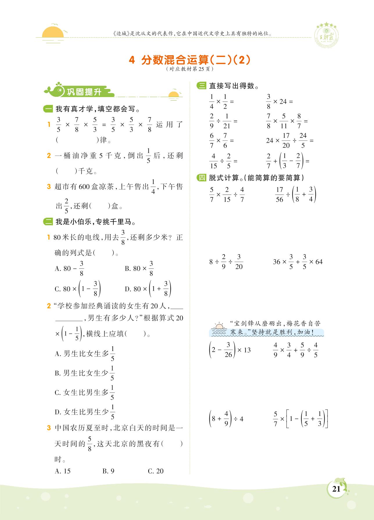 2021上册六年级数学北师版 第二单元 分数混合运算——4 分数混合运算(二)(2)