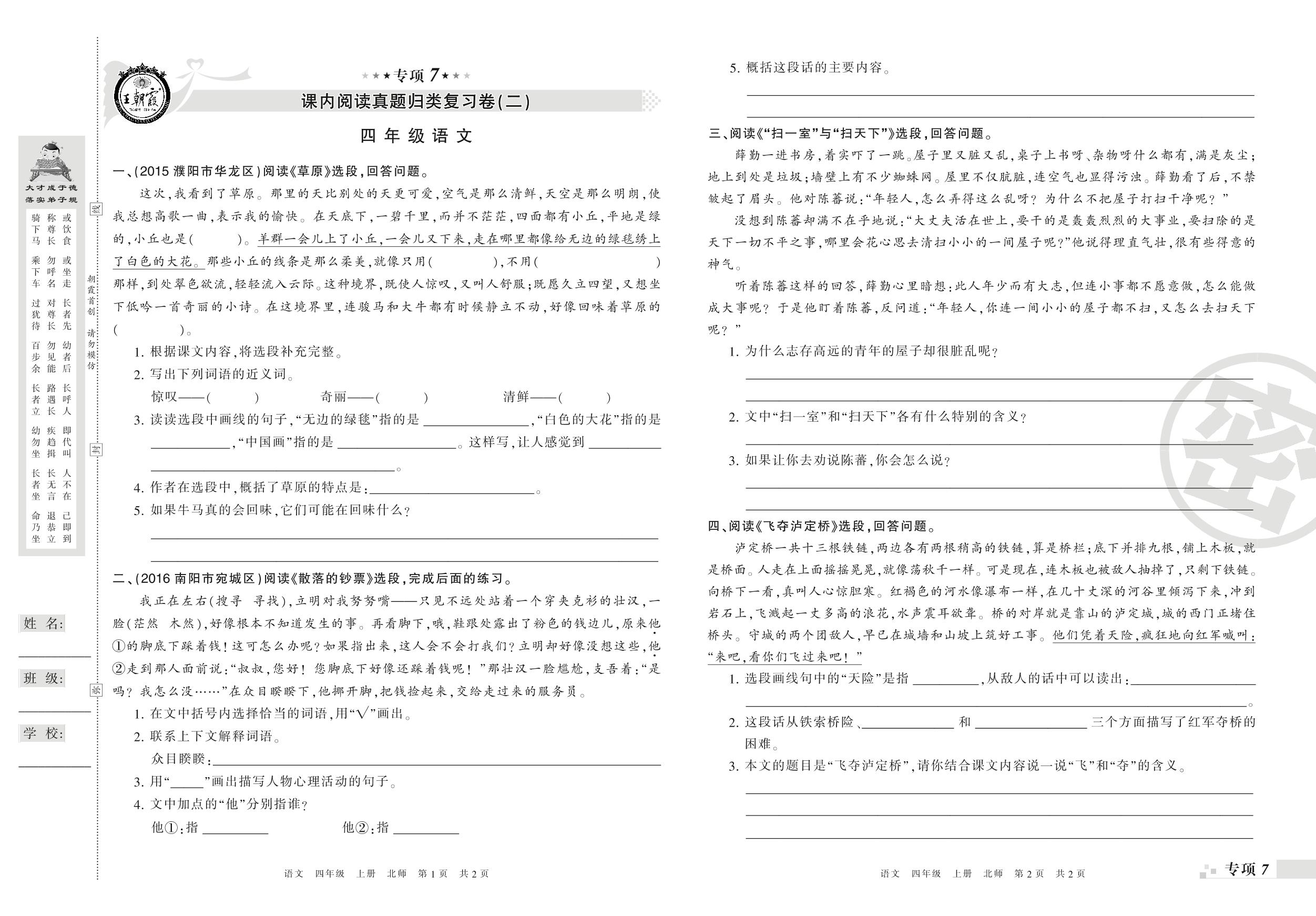 王朝霞期末专项卷——课内阅读、课外阅读与写作真题归类复习四年级上册语文(北师版)【0】