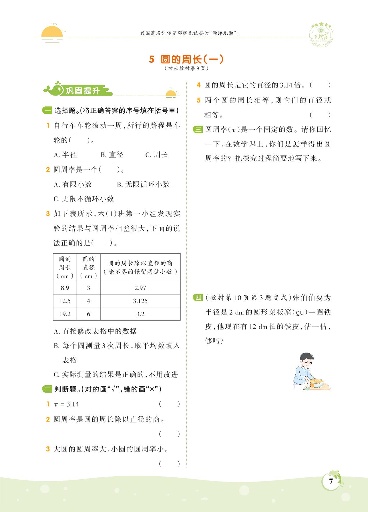 2021上册六年级数学北师版 第一单元 圆——5 圆的周长(一)