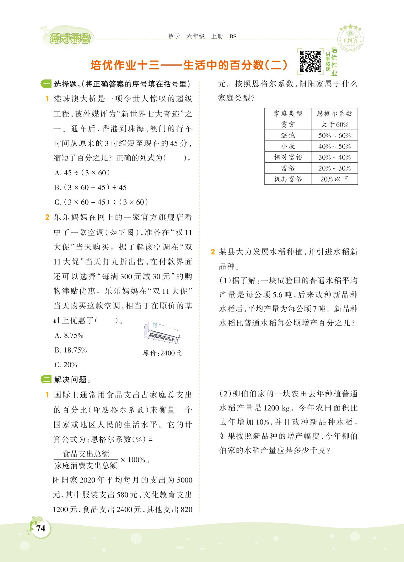 2021上册六年级数学北师版 第七单元 百分数的应用——培优作业十三 生活中的百分数(二)