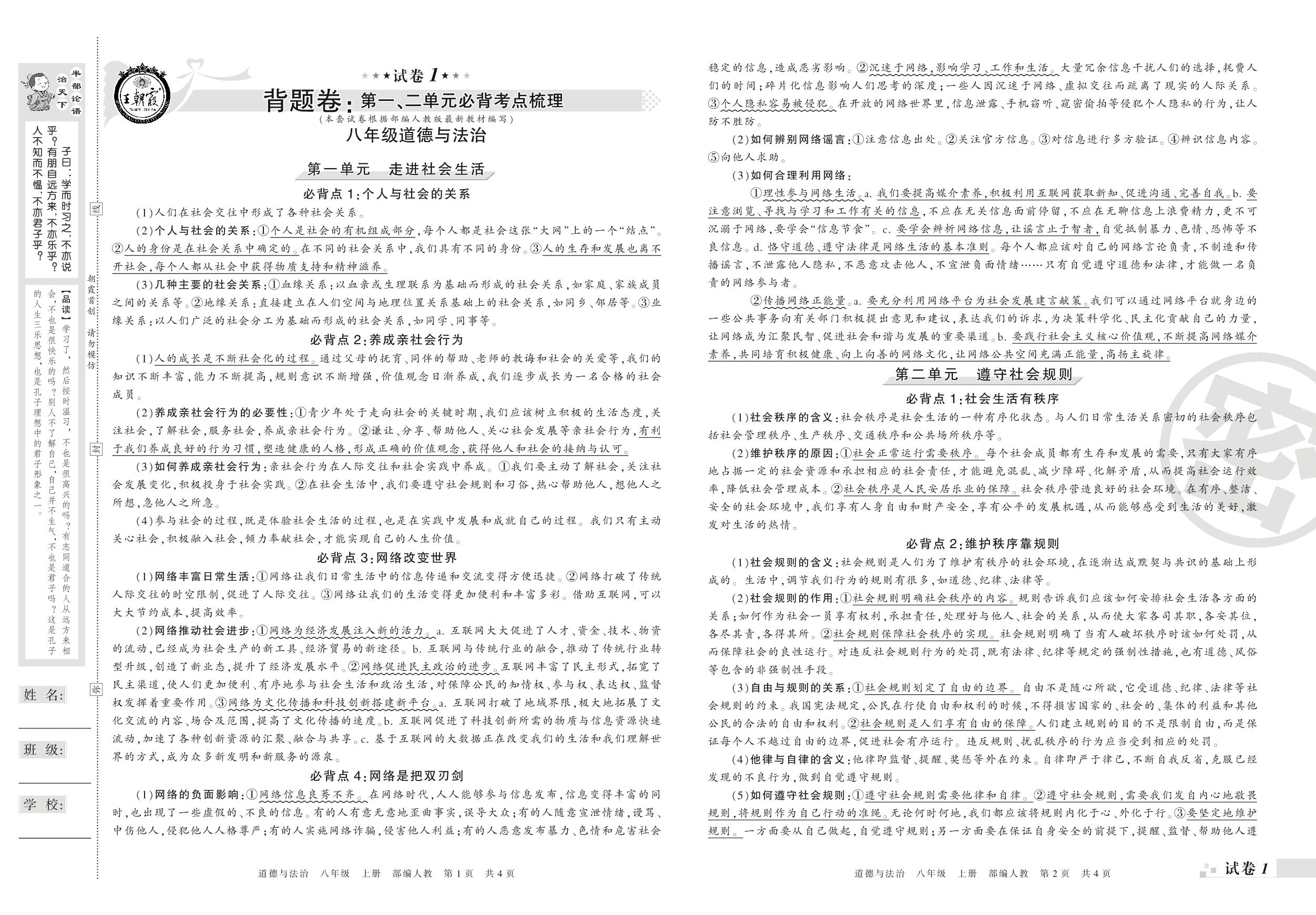 王朝霞期末背题卷——第一、二单元必背考点梳理八年级上册道德与法治(人教版)