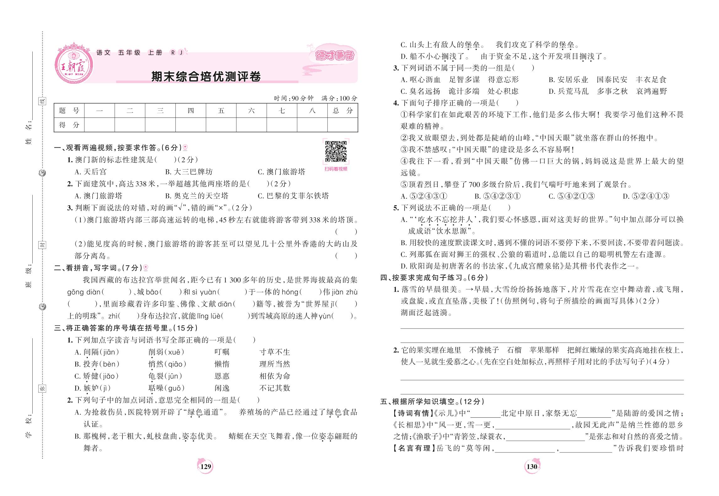 2021上册五年级语文人教版 期末综合培优测评卷
