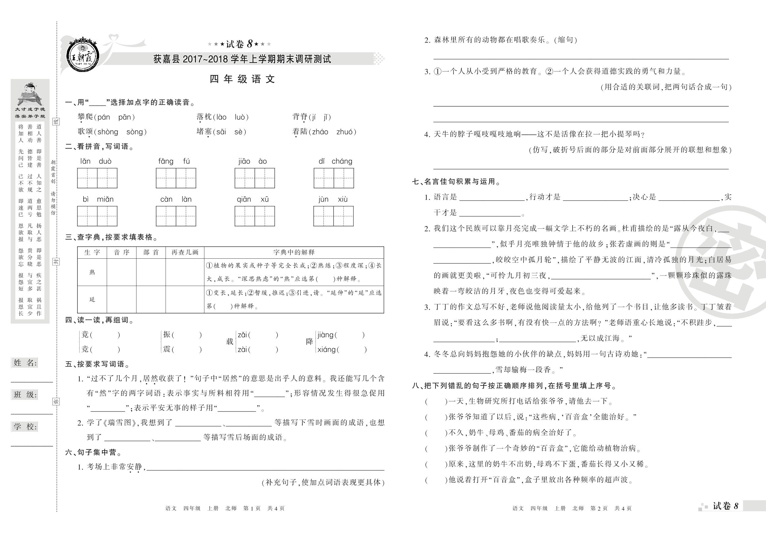 2017-2018学年第一学期新乡市获嘉县四年级语文试卷(北师版)【8】