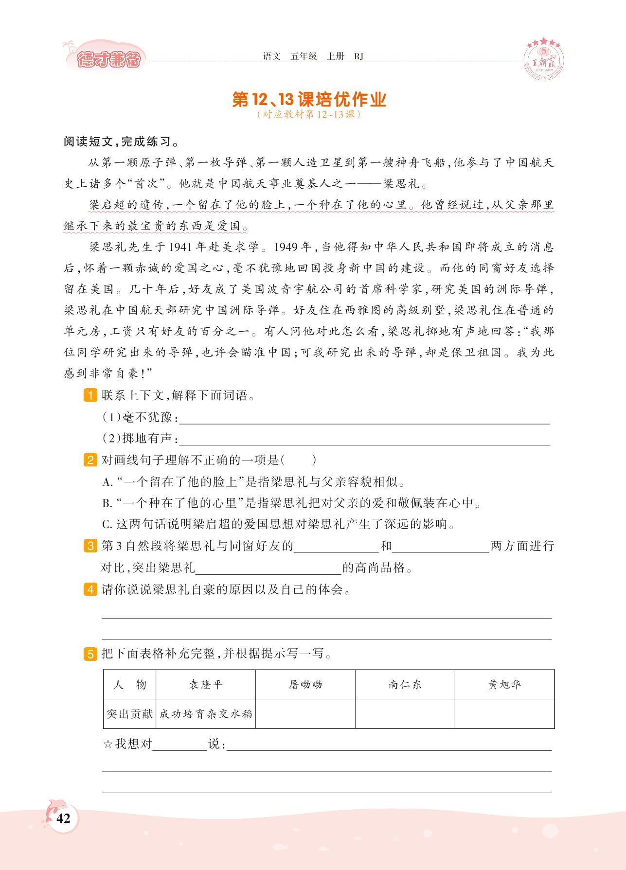 2021上册五年级语文人教版 第四单元——第12、13课培优作业