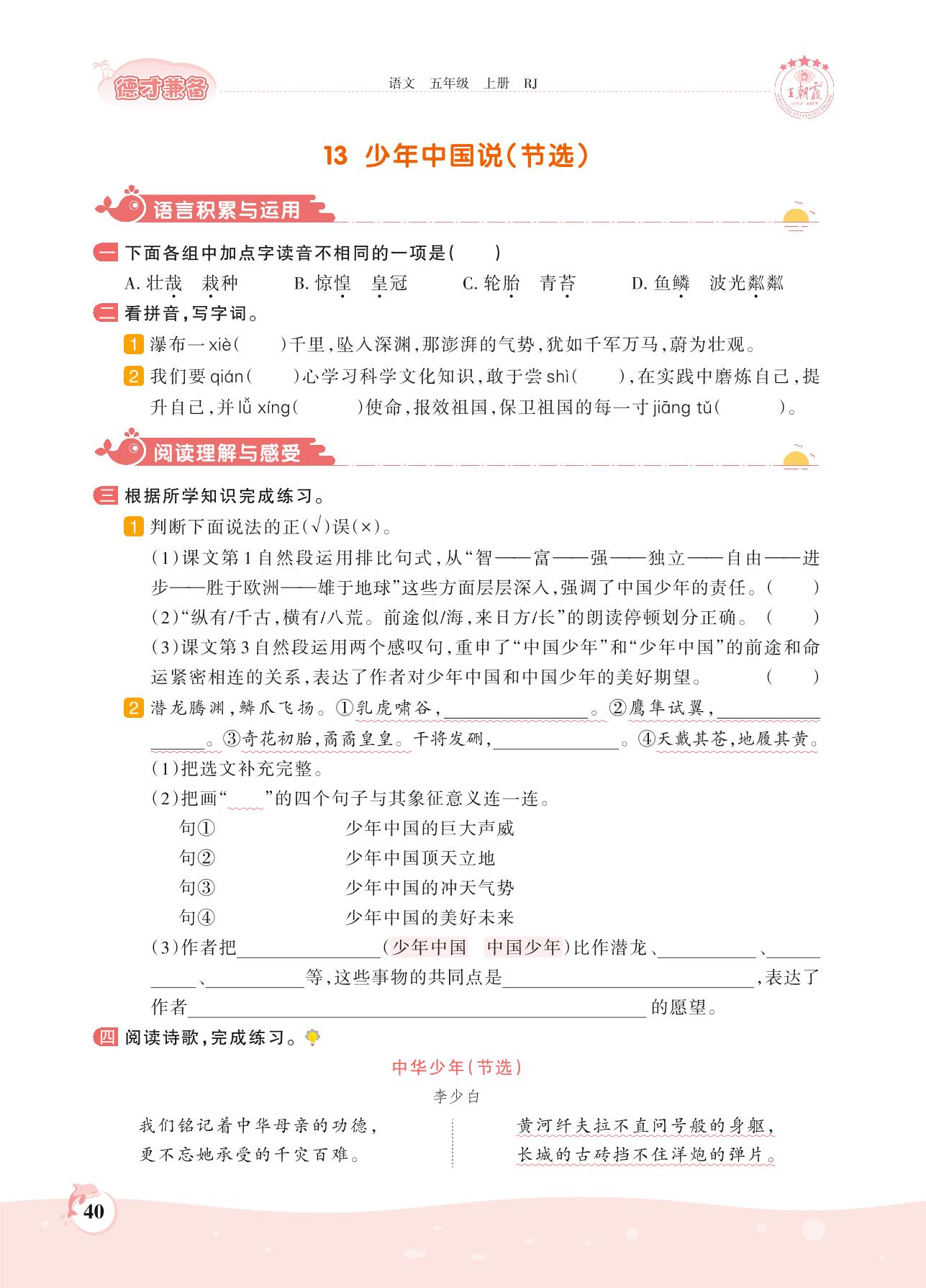 2021上册五年级语文人教版 第四单元——13 少年中国说(节选)