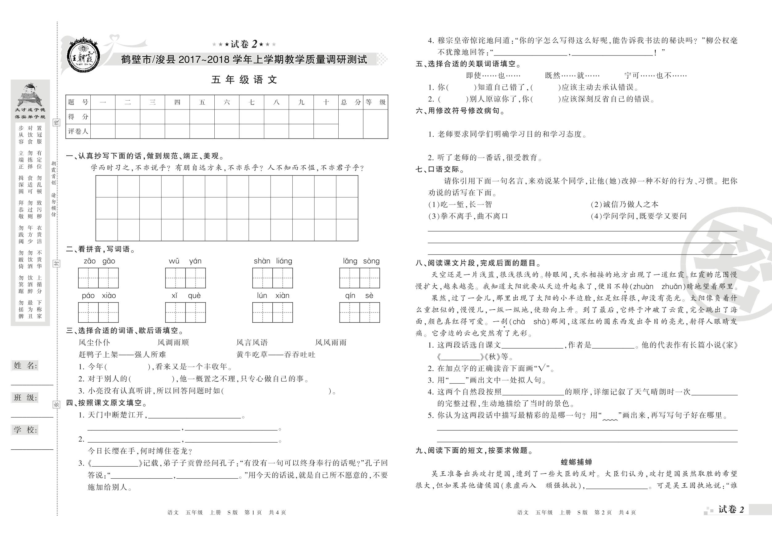 2017-2018学年第一学期鹤壁市 浚县五年级语文试卷(S版)【2】