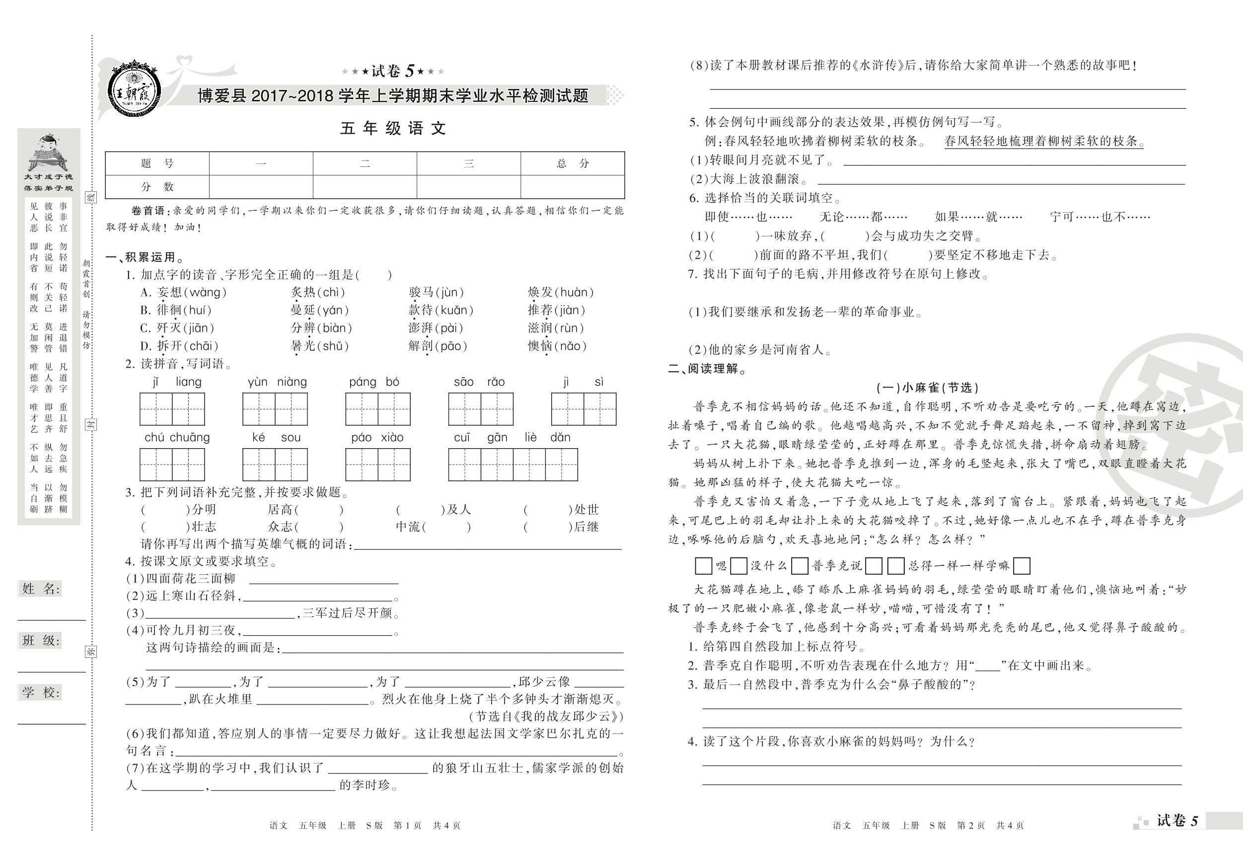 2017-2018学年第一学期焦作市博爱县五年级语文试卷(S版)【5】