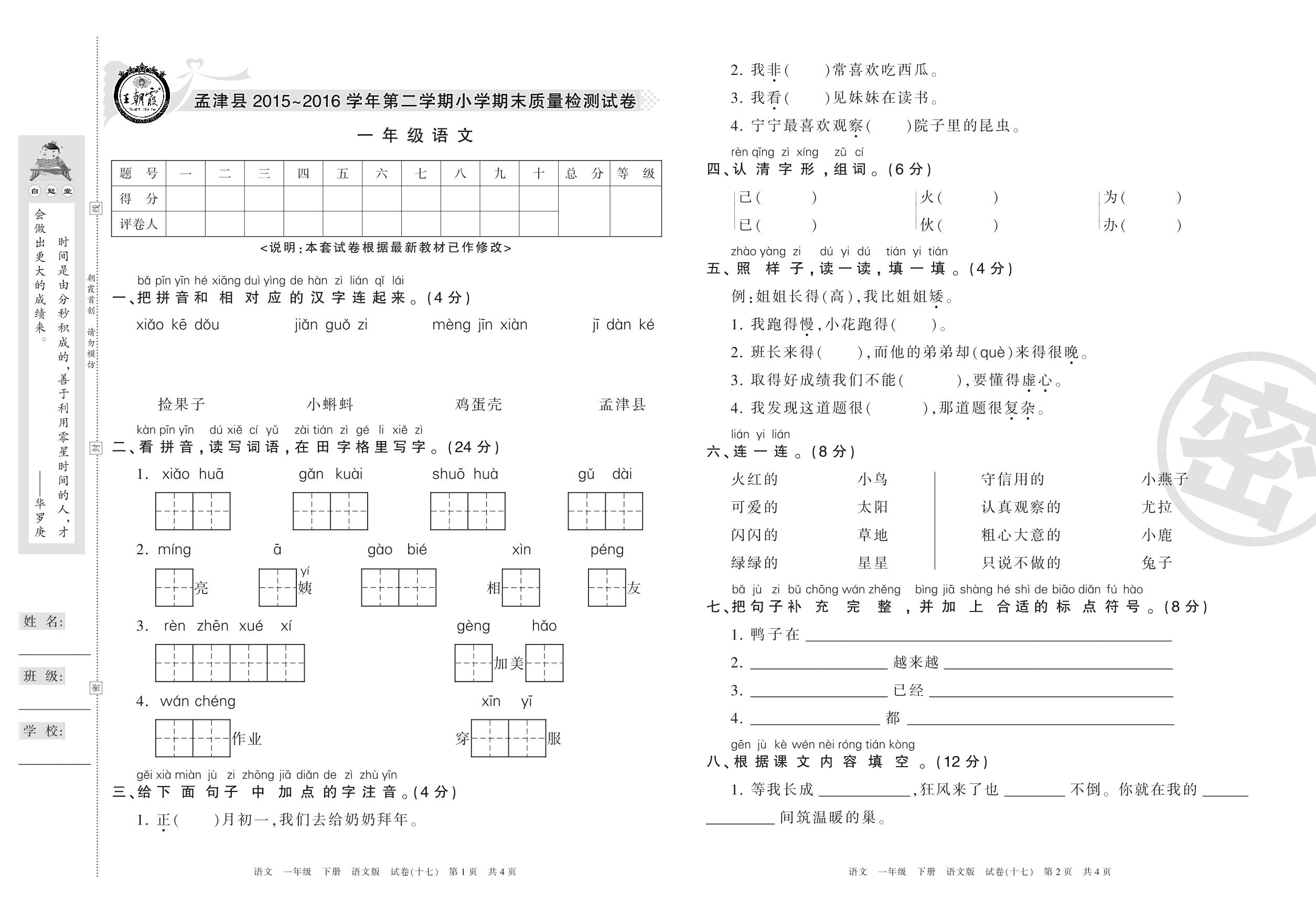2015-2016学年第二学期洛阳市孟津县一年级语文试卷(语文版)【17】