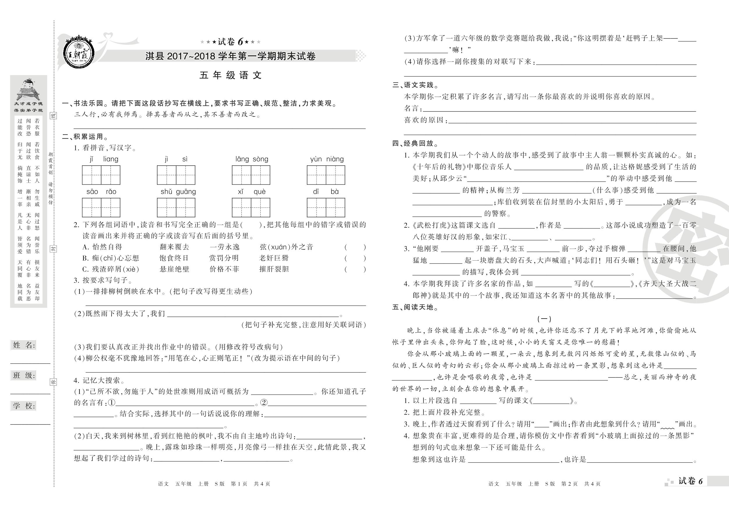 2017-2018学年第一学期鹤壁市淇县五年级语文试卷(S版)【6】