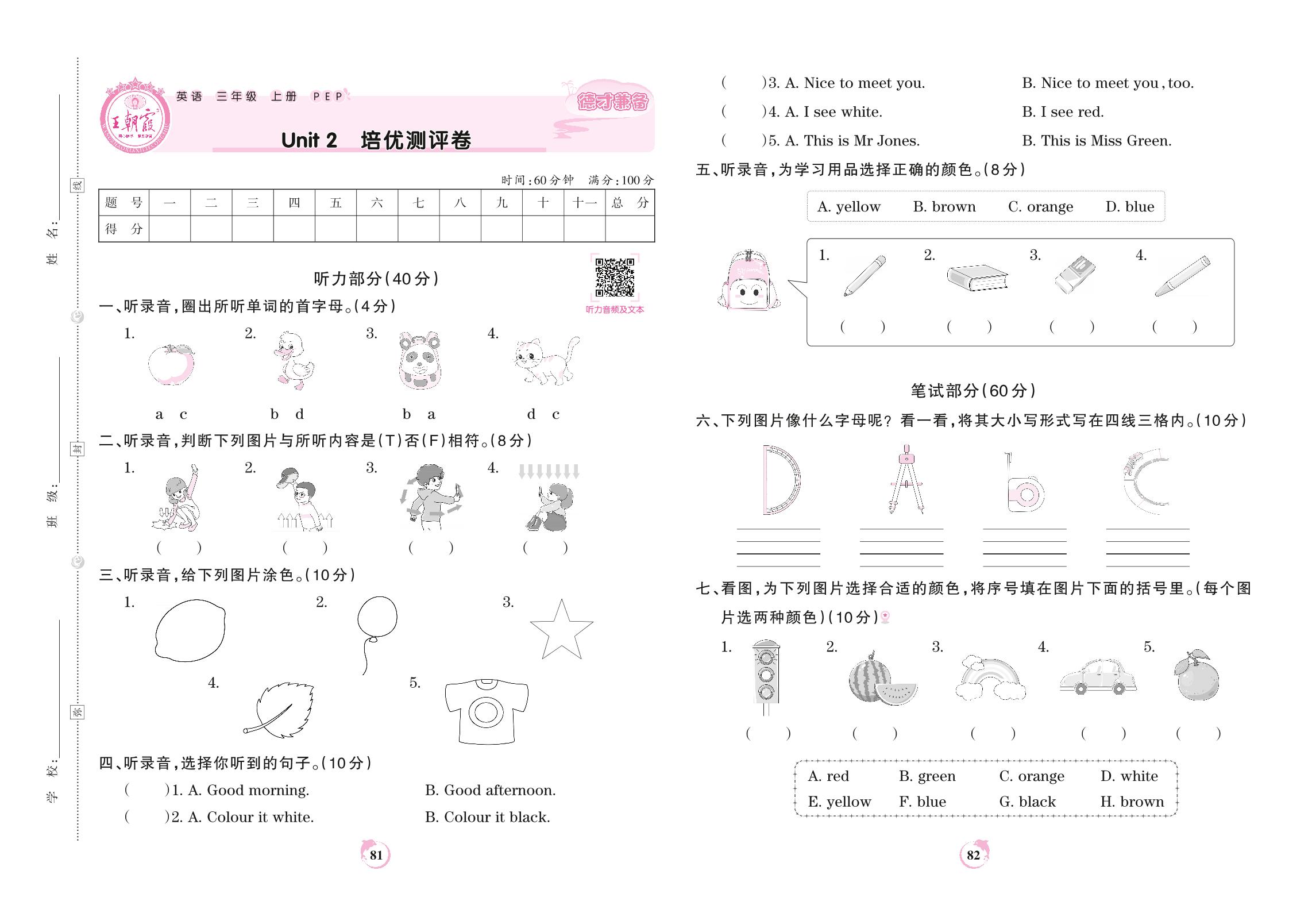 2021上册三年级英语人教PEP版 Unit 2 培优测评卷
