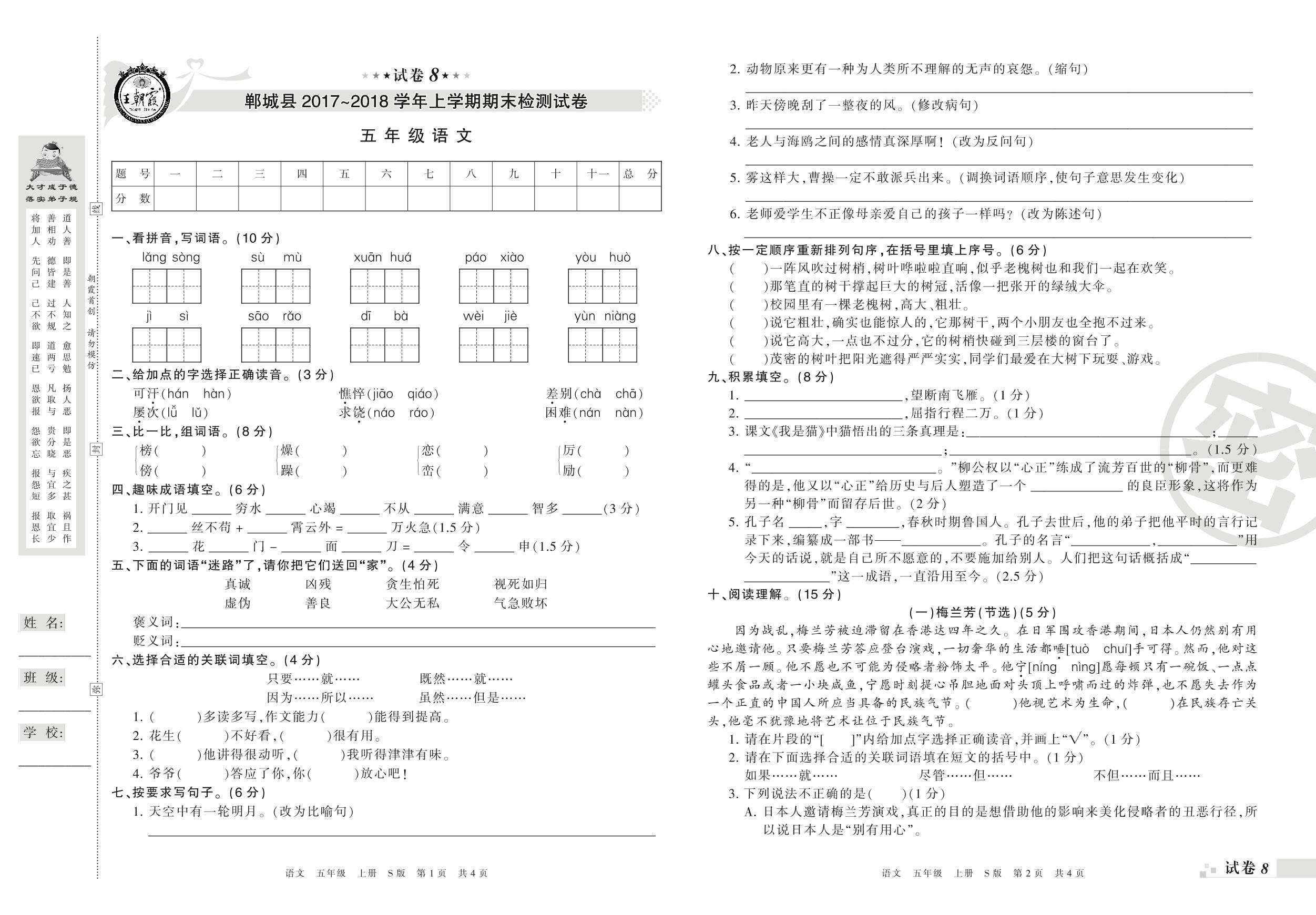 2017-2018学年第一学期周口市郸城县五年级语文试卷(S版)【8】
