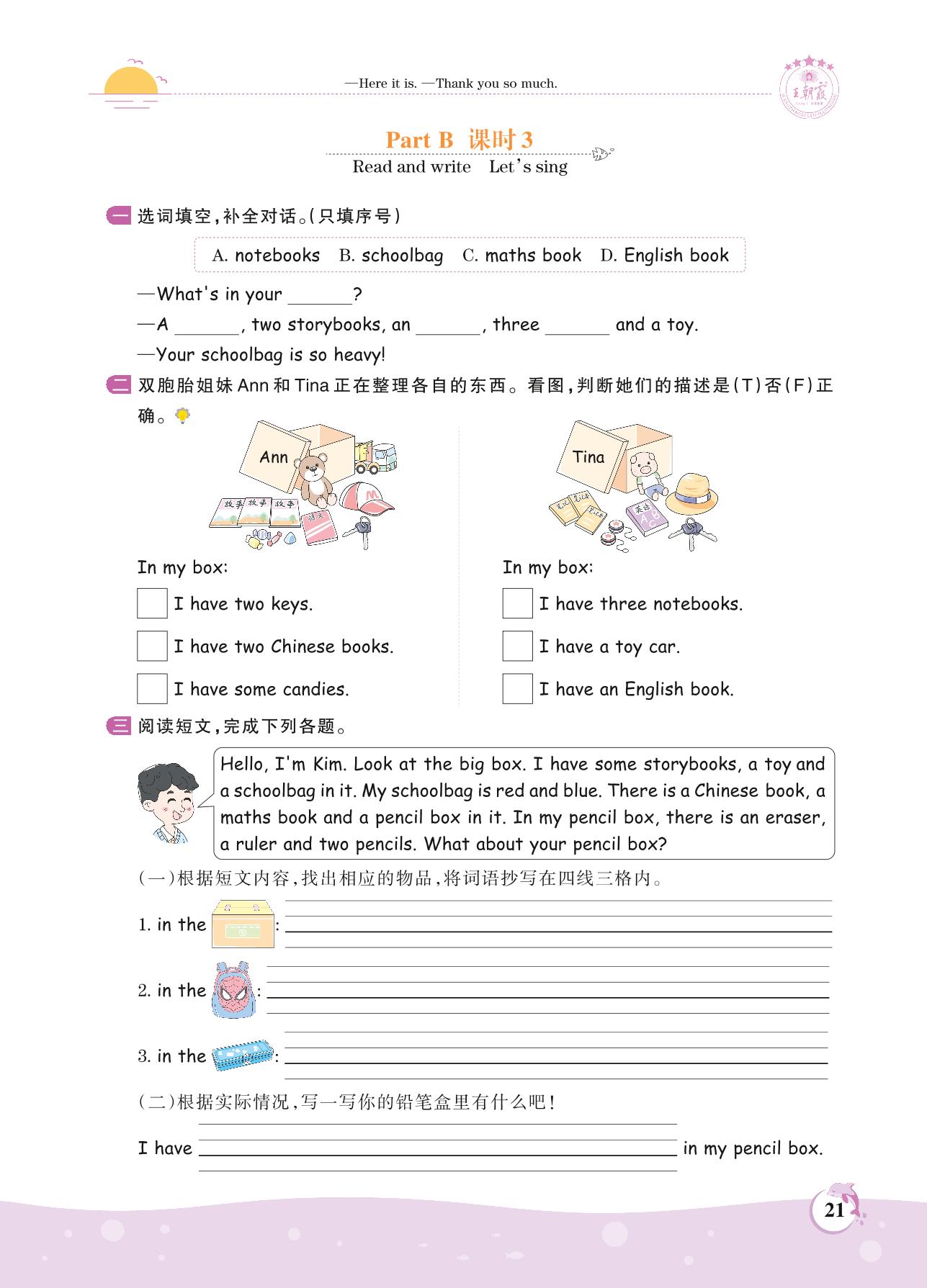 2021上册四年级英语人教PEP版 Unit 2 Part B—课时 3 Read and write Let’s sing