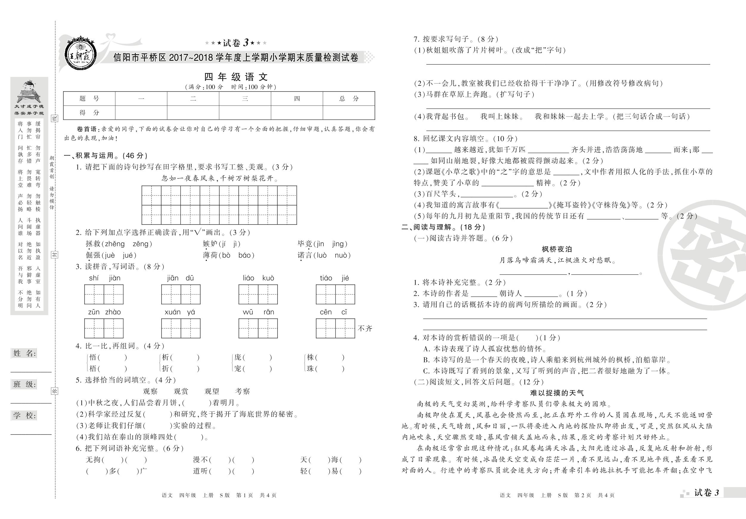 2017-2018学年第一学期信阳市平桥区四年级语文试卷(S版)【3】