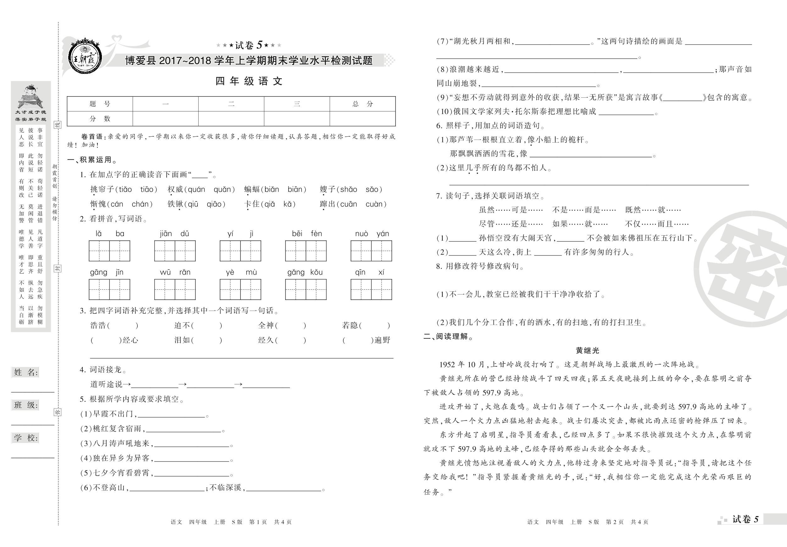 2017-2018学年第一学期焦作市博爱县四年级语文试卷(S版)【5】