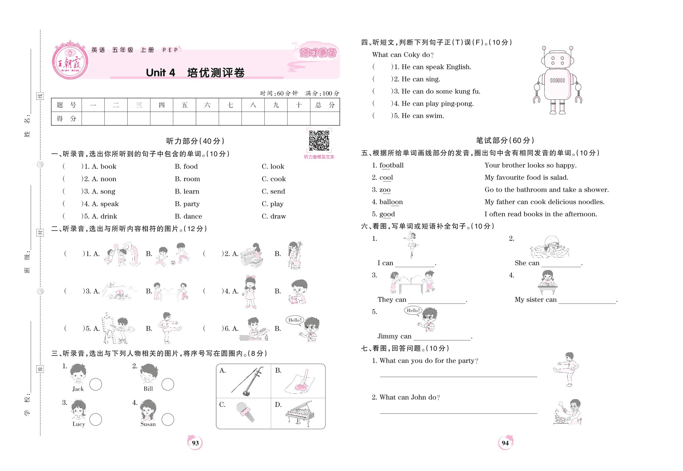 五年级英语人教PEP版(三起始)上册单元卷