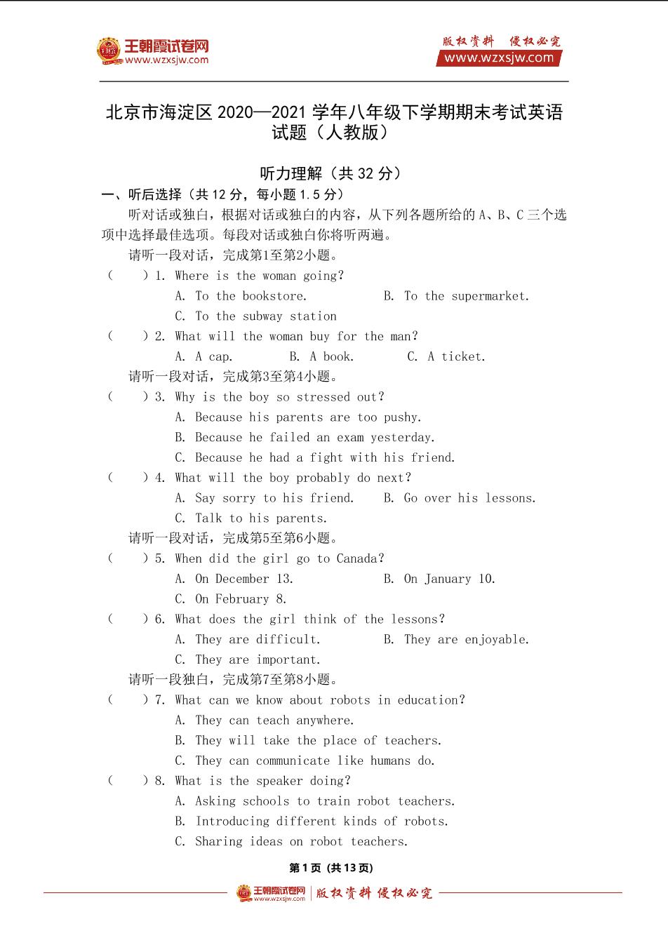 北京市海淀区2020—2021学年八年级下学期期末考试英语试题(人教版)【无听力音频】