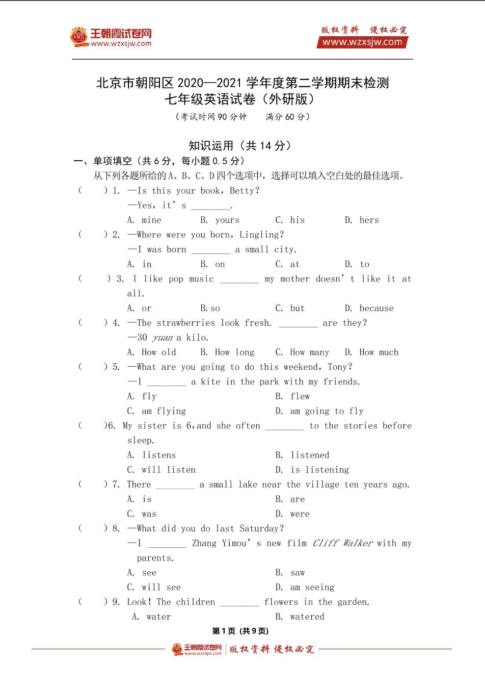 北京市朝阳区2020—2021学年度第二学期期末检测七年级英语试卷(外研版)【无听力音频】