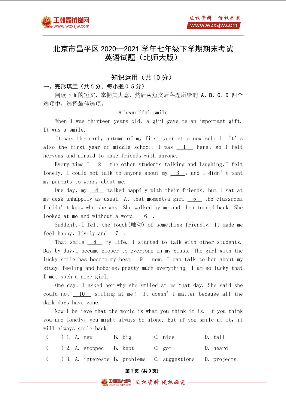 北京市昌平区2020—2021学年七年级下学期期末考试英语试题(北师大版)【无听力音频】