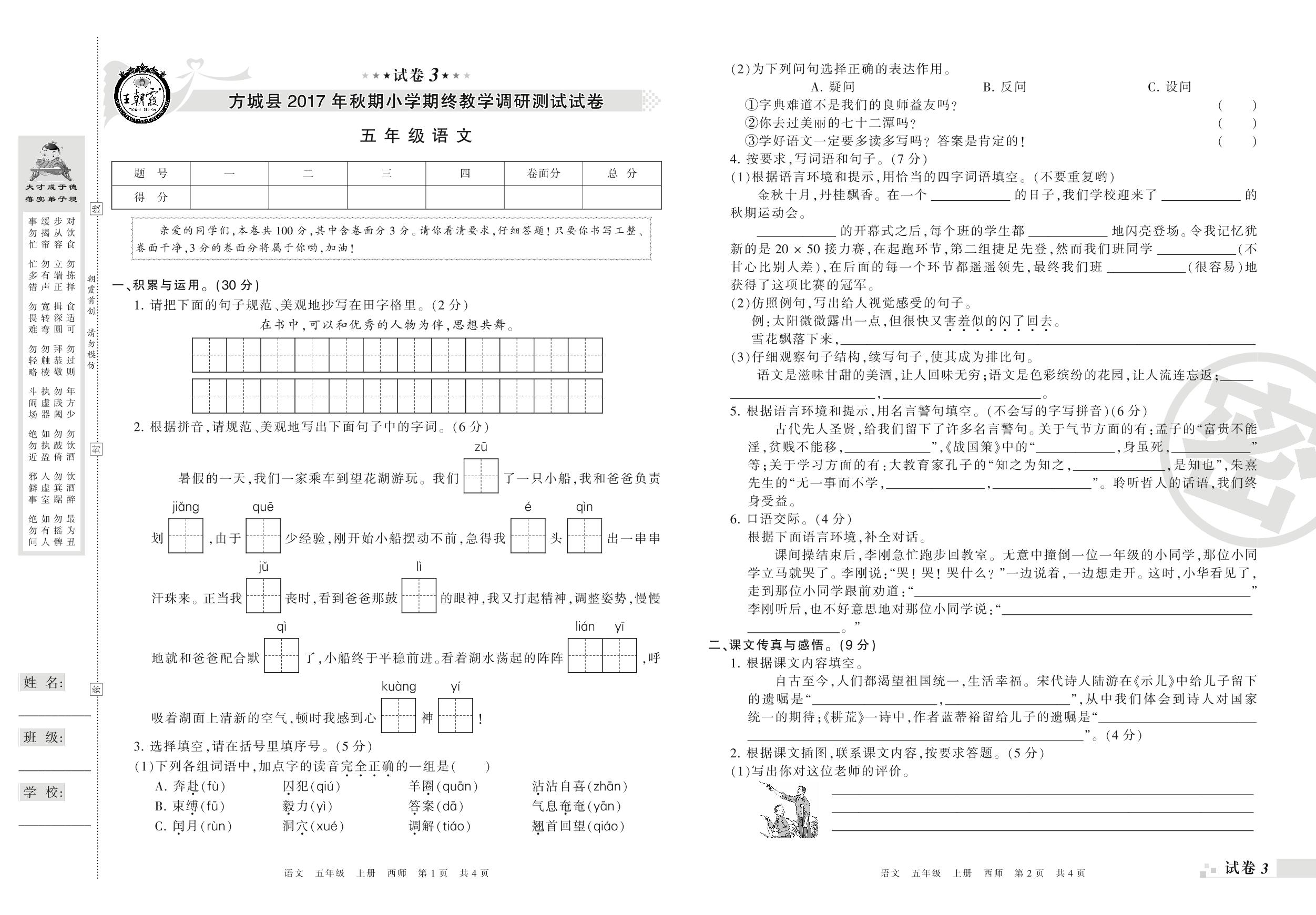 2017-2018学年第一学期南阳市方城县五年级语文试卷(西师版)【3】