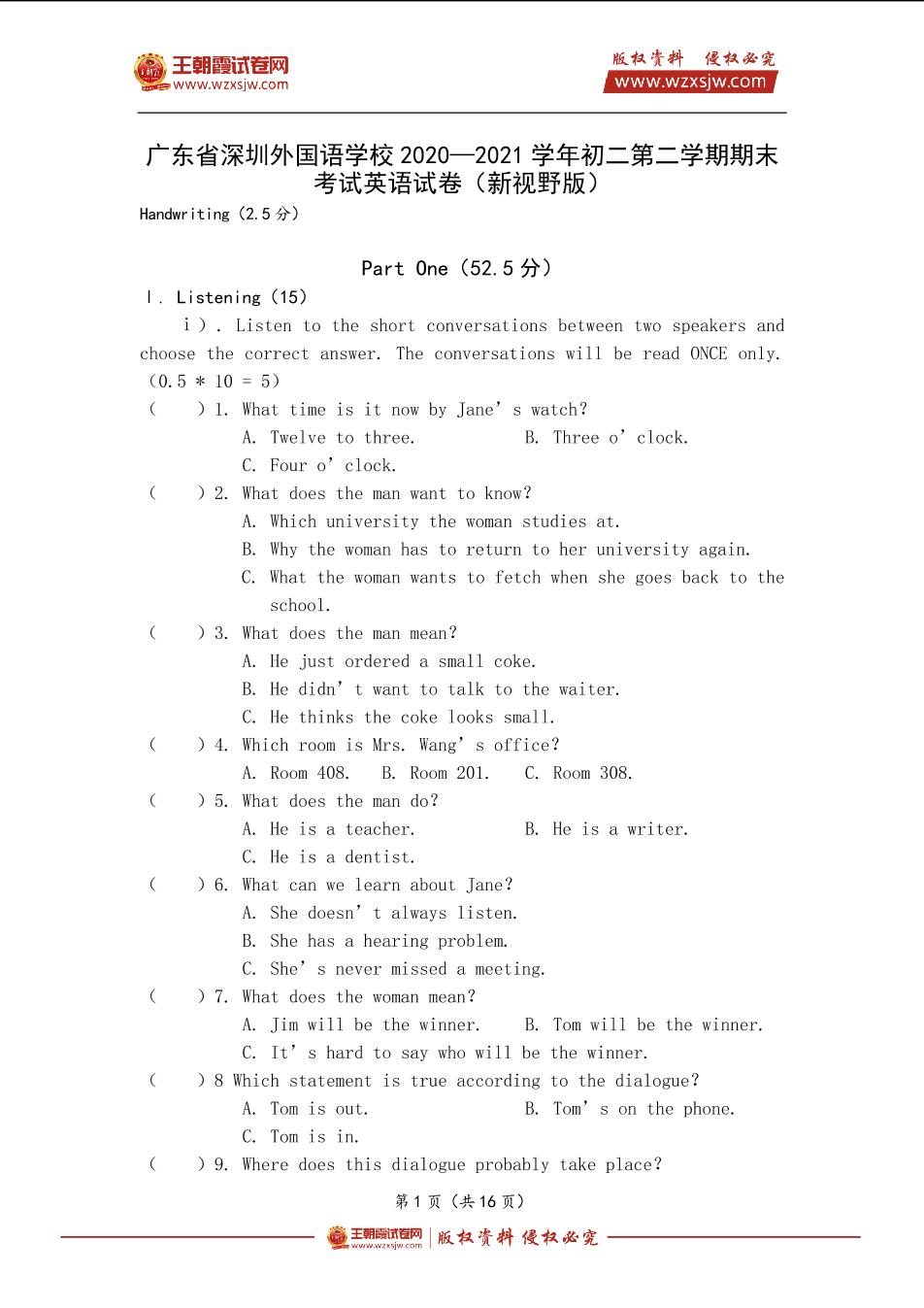 广东省深圳外国语学校2020—2021学年初二第二学期期末考试英语试卷(新视野版)