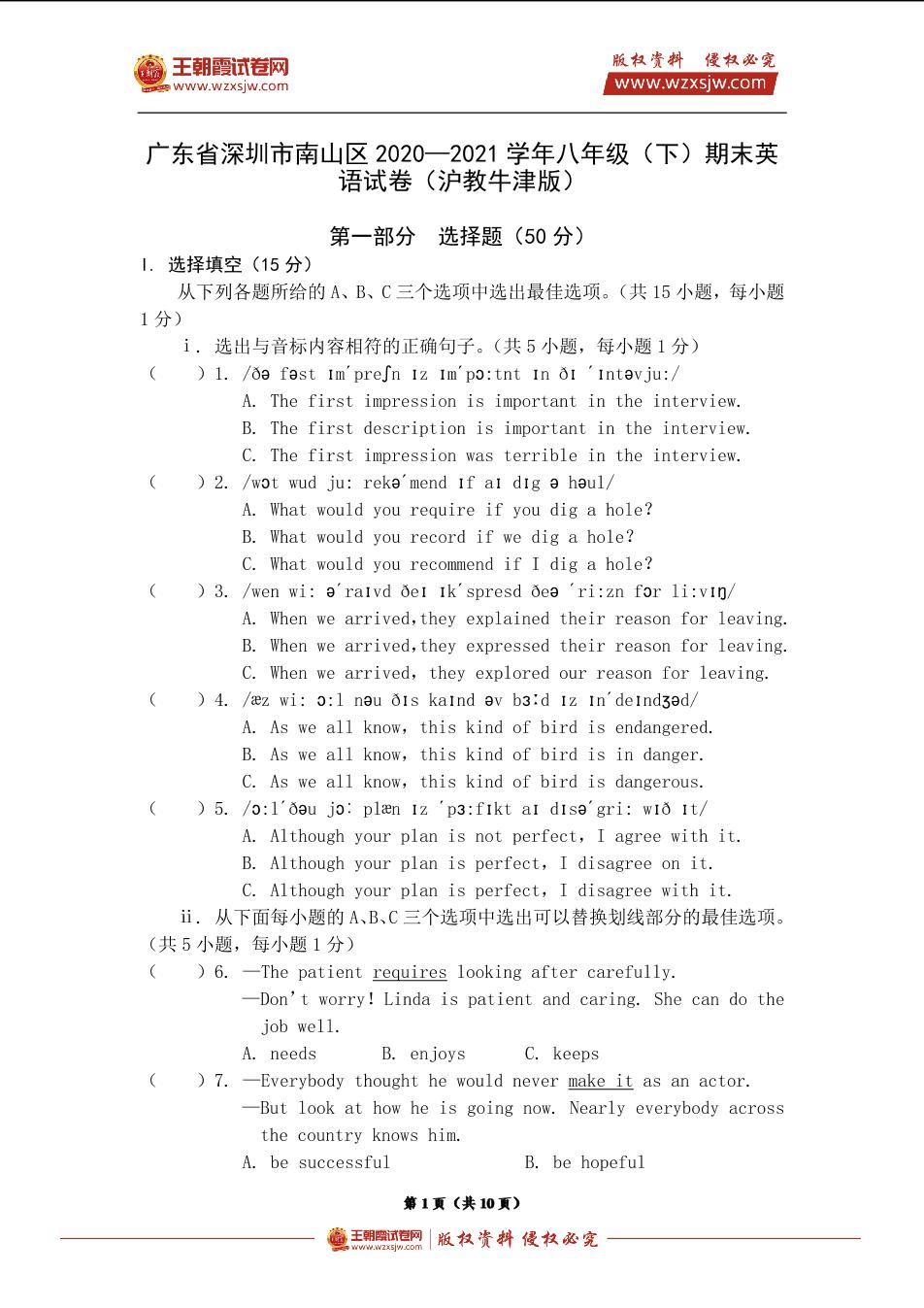 广东省深圳市南山区2020—2021学年八年级(下)期末英语试卷(沪教牛津版)