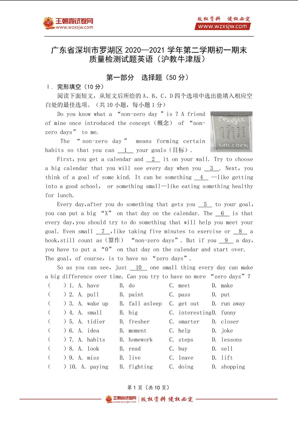 广东省深圳市罗湖区2020—2021学年第二学期初一期末质量检测试题英语(沪教牛津版)