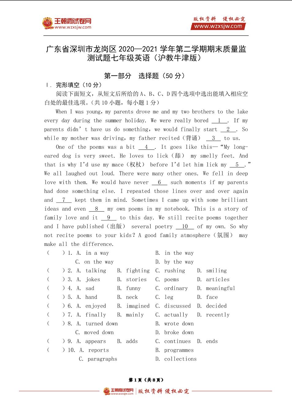 广东省深圳市龙岗区2020—2021学年第二学期期末质量监测试题七年级英语(沪教牛津版)