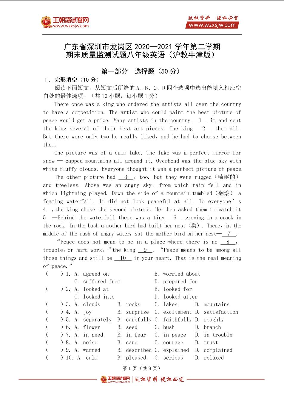 广东省深圳市龙岗区2020—2021学年第二学期期末质量监测试题八年级英语(沪教牛津版)