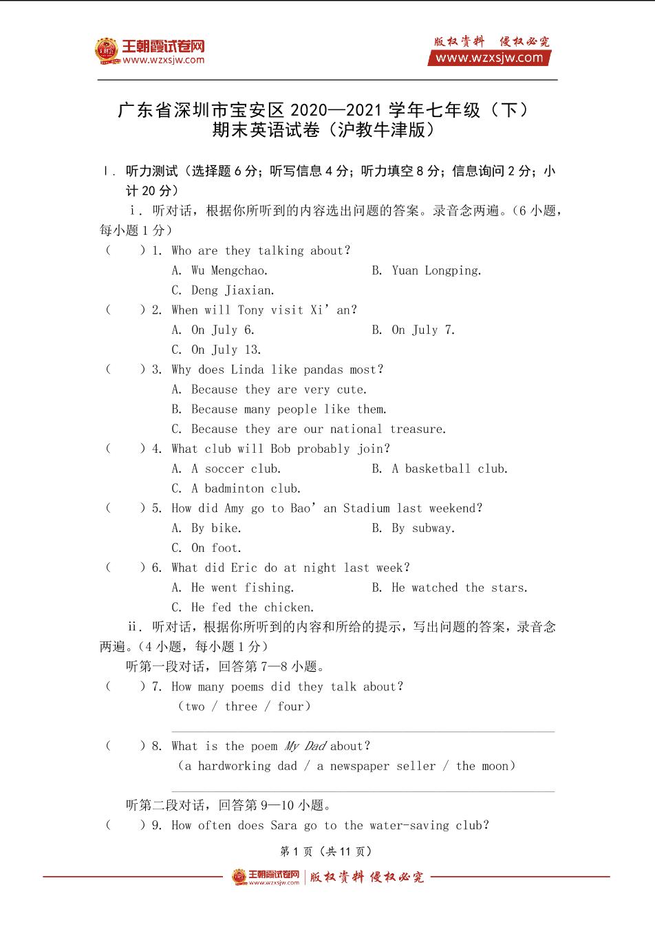 广东省深圳市宝安区2020—2021学年七年级(下)期末英语试卷(沪教牛津版)