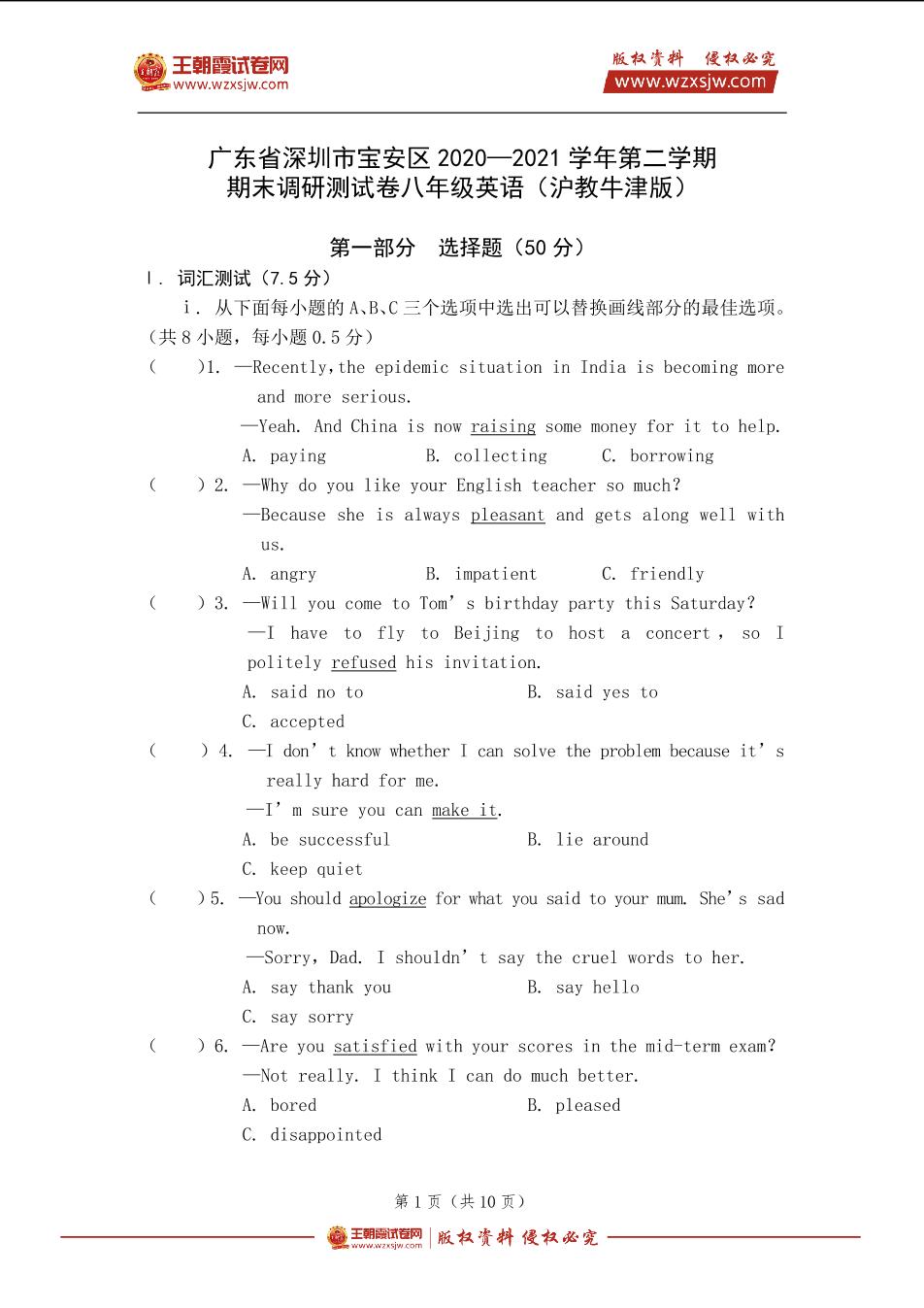 广东省深圳市宝安区2020—2021学年第二学期期末调研测试卷八年级英语(沪教牛津版)