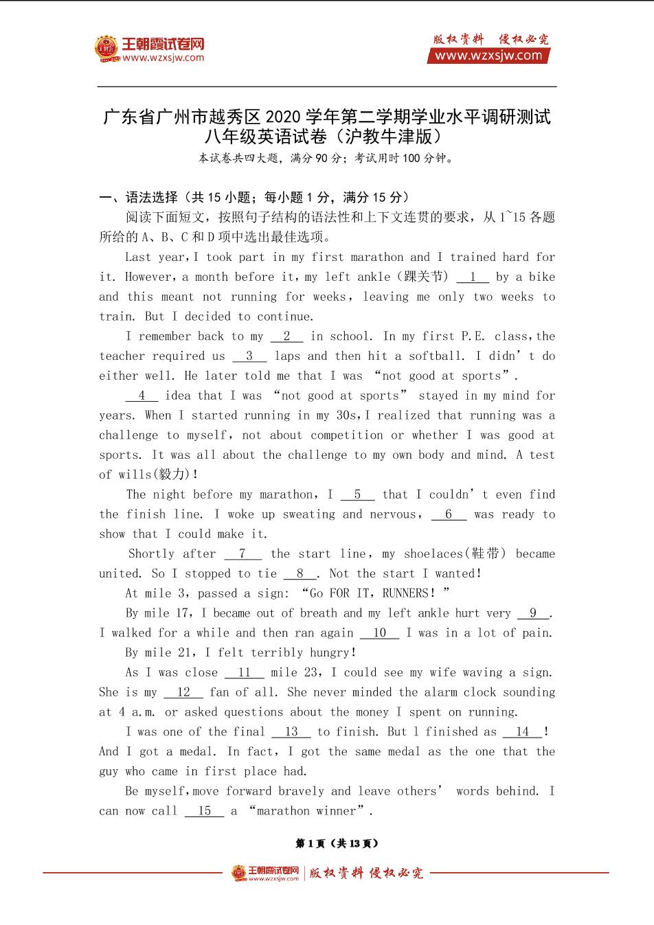 广东省广州市越秀区2020学年第二学期学业水平调研测试八年级英语试卷(沪教牛津版)