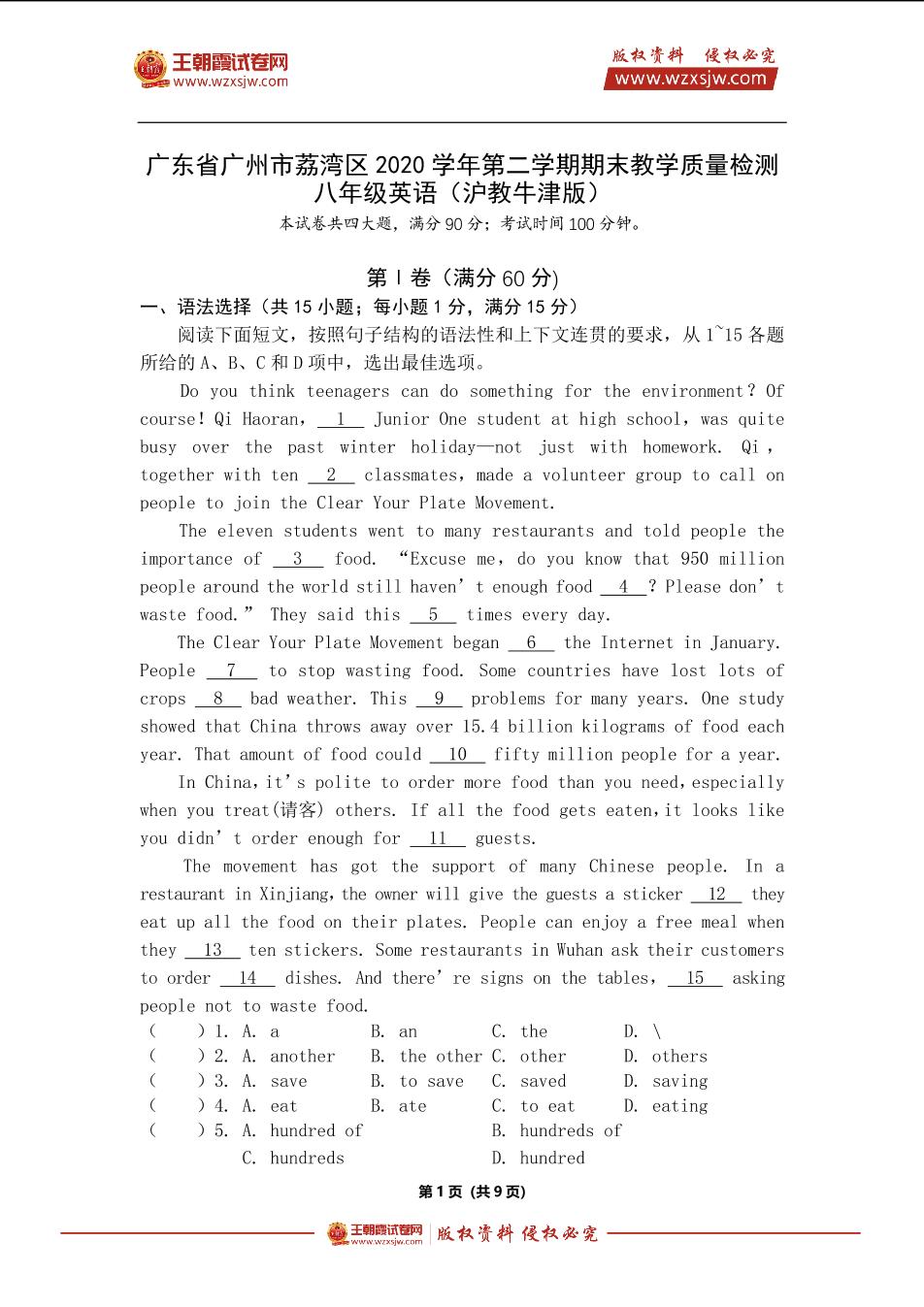 广东省广州市荔湾区2020学年第二学期期末教学质量检测八年级英语(沪教牛津版)