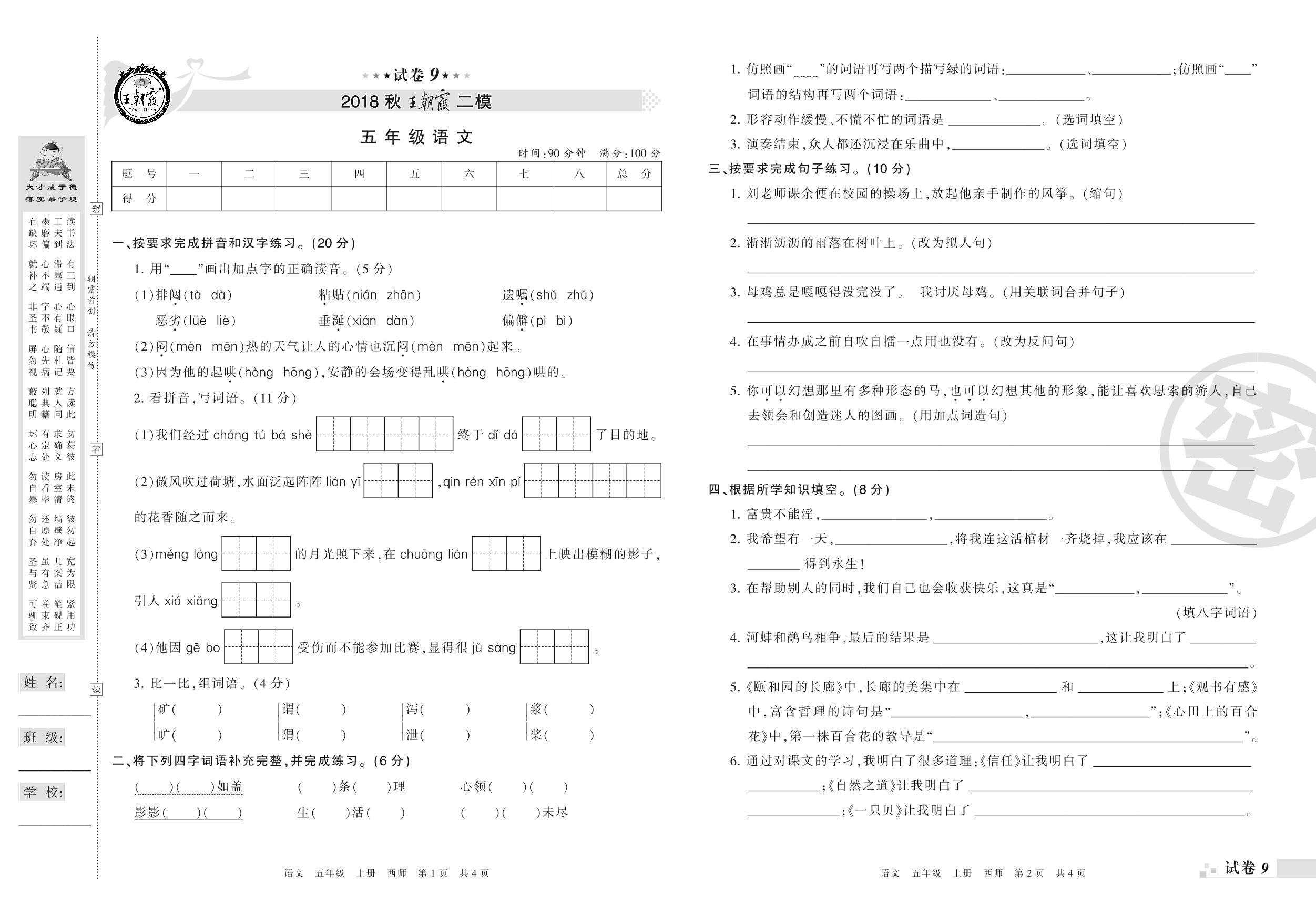 王朝霞期末模拟卷五年级上册语文(西师版)【9】