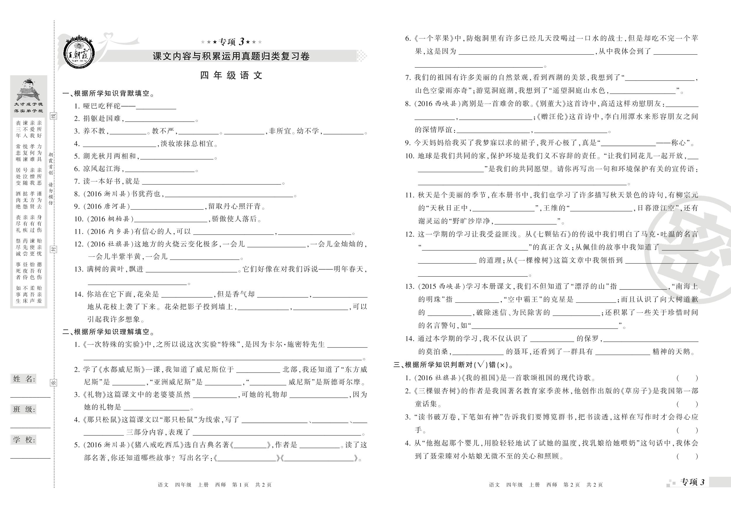 王朝霞期末专项卷——课文内容与积累运用、课内阅读与写作真题归类复习四年级上册语文(西师版)【0】