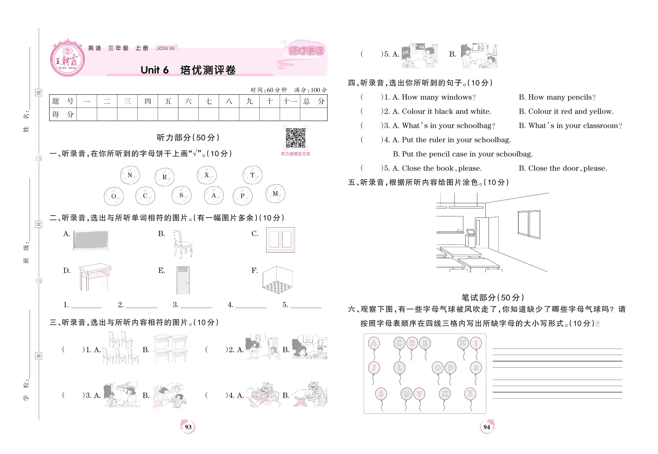 三年级英语剑桥版上册单元卷