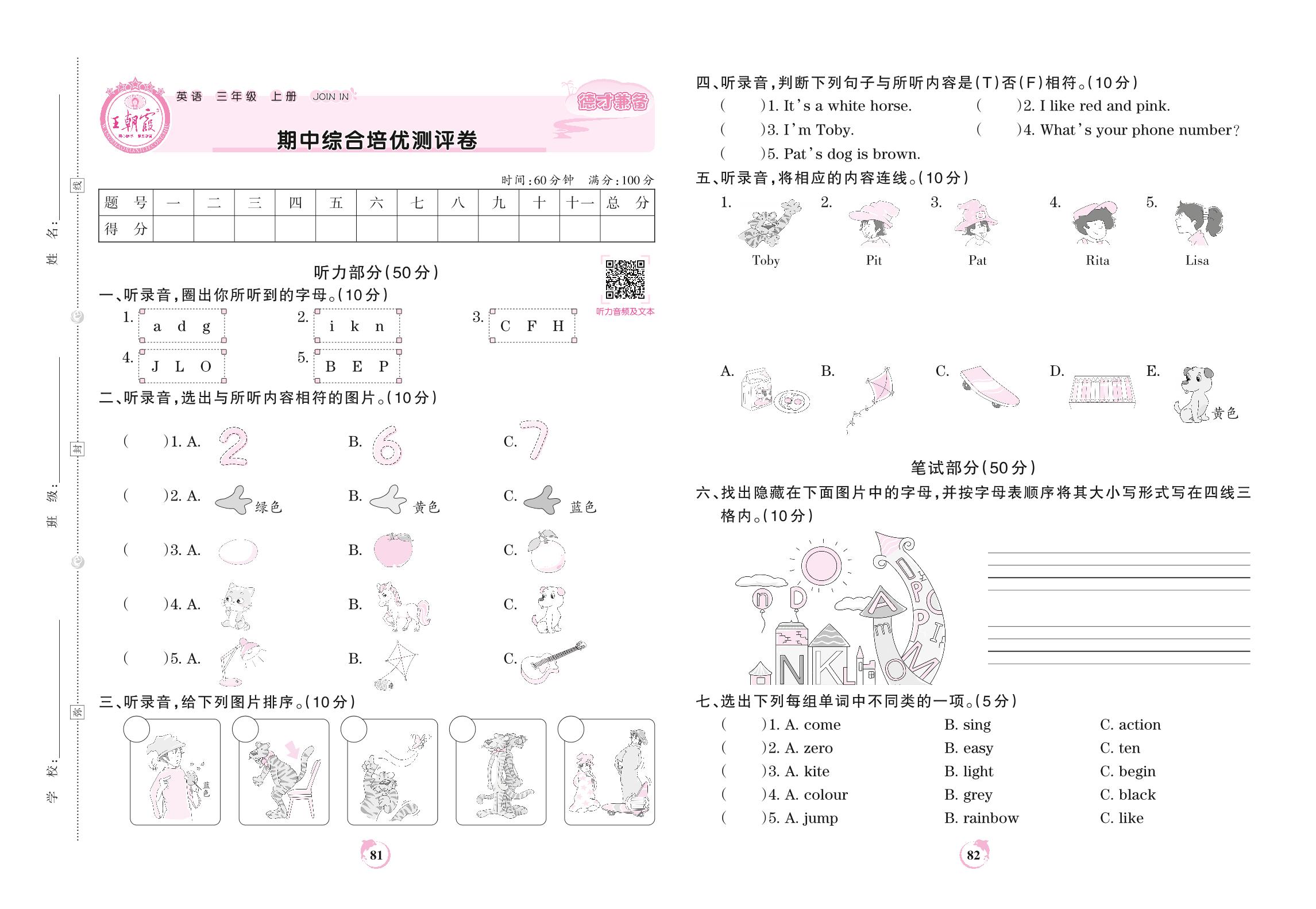 2021上册三年级英语剑桥版 期中综合培优测评卷